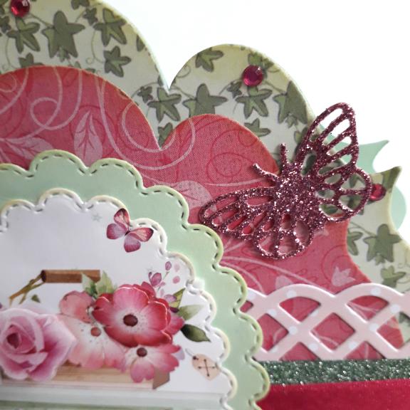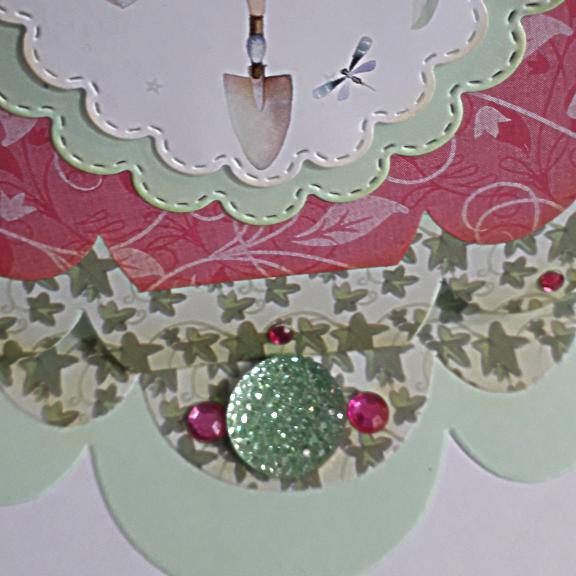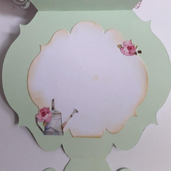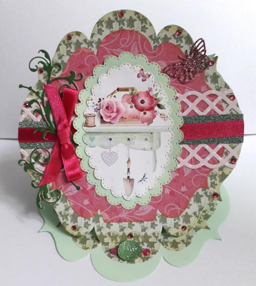 A shaped easel card with a picture of a pretty garden shelf, this is an a pink patterned panel and an ivy patterned background, the base card is light green. I have added a pink die cut strip with ribbons across the middle and embellished with die cut foliage and a bow, gems act as a stopper. Inside I have placed a blank white panel for your message.