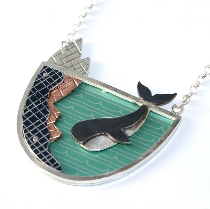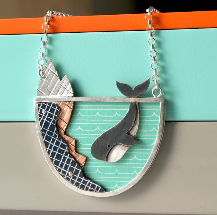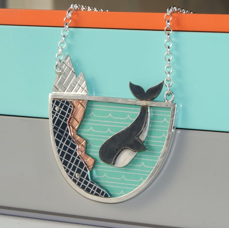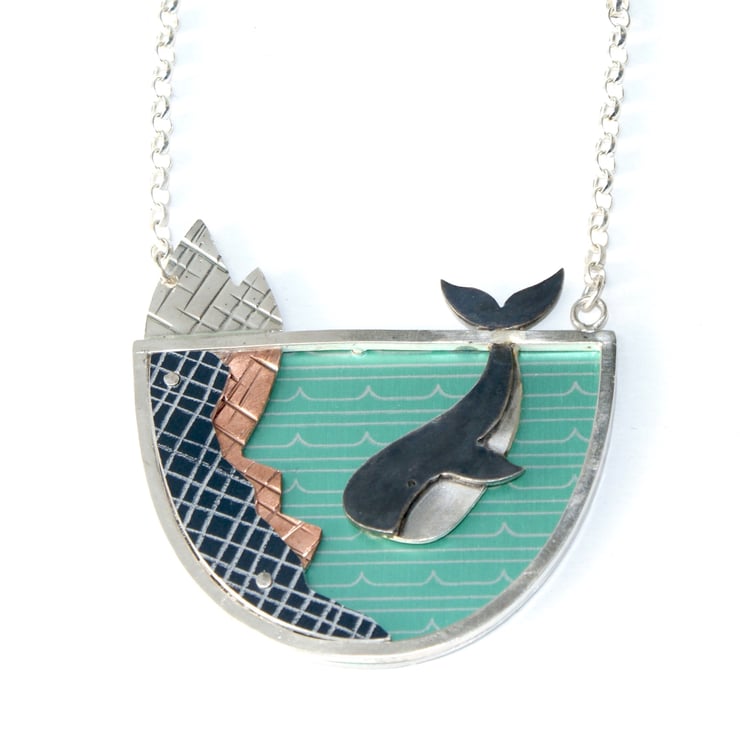 Made to order. An unusual statement necklace featuring a whale diving into the sea. This necklace is made from anodised aluminium and sterling silver and each piece has been carefully cut with a piercing saw and constructed in layers. The coloured aluminium pieces are patterned with a resist and immersion dyed. The silver and copper pieces have been textured in part and the whale is partly oxidised. The sterling silver chain is adjustable in length and can be worn at about 17 or 19 inches. Please note that each piece is completely made by hand and therefore may vary very slightly from the image.