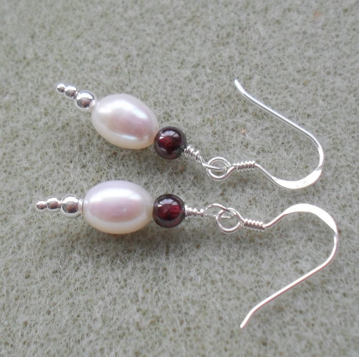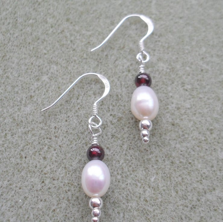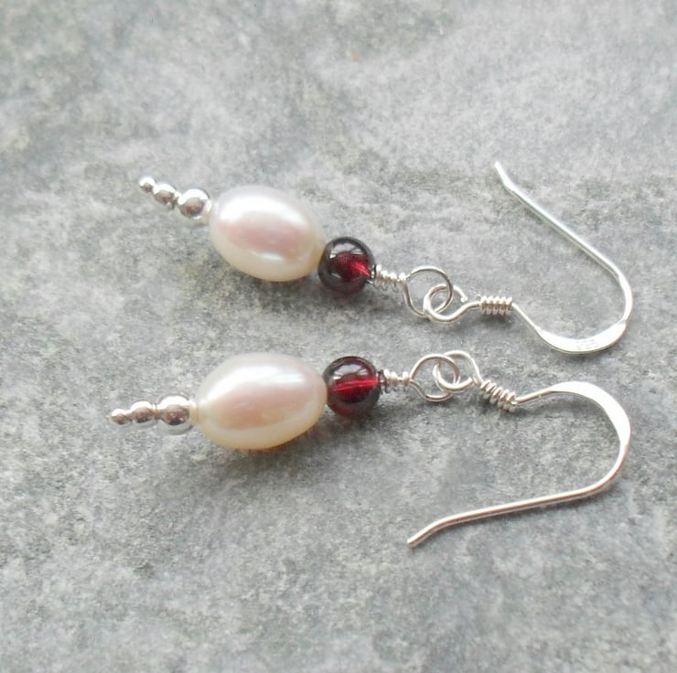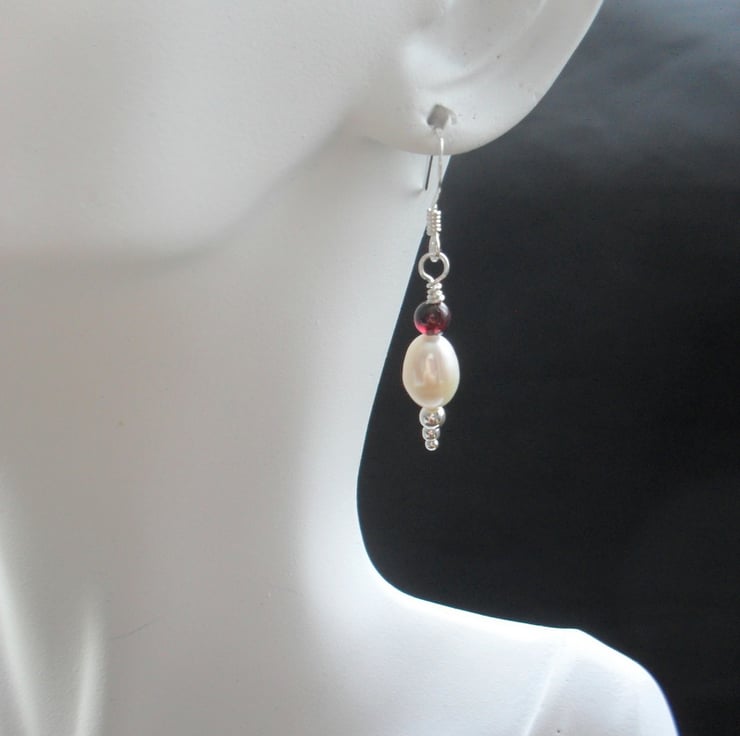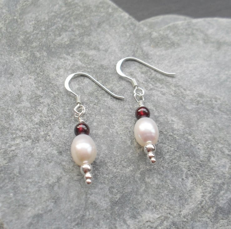 Dainty earrings with freshwater cultured pearls and garnet gemstones which are attached to sterling silver ear wires