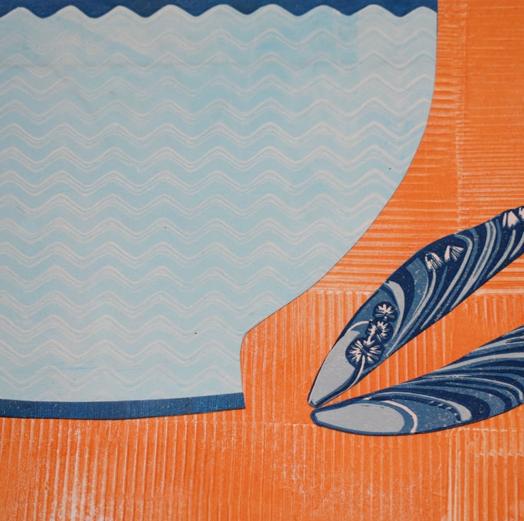 I've chopped up the misprints from my popular 'Mussels and Barnacles' lino print and cooked them up into a bowl of sweet moules with plenty of white wine and garlic and served them up in a bright orange kitchen.