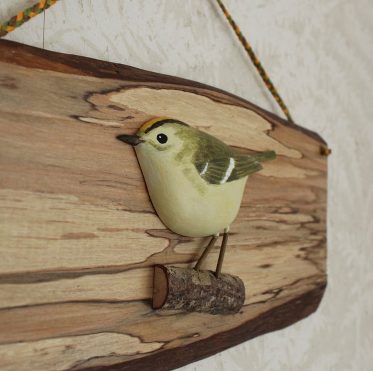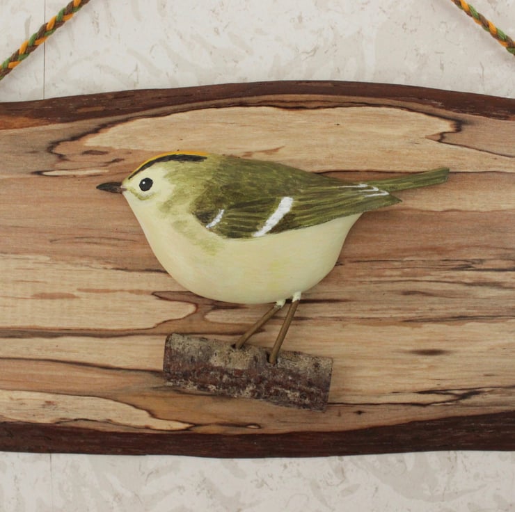 I have hand carved this goldcrest from 10mm thick lime. It has been painted with artists acrylics and has painted wire legs allowing it to sit on a piece of branch. It is all mounted on a spalted beech panel and the piece is 20cm x 10cm (not including the hanging loop) It has been finished with wax to give a soft shine and is hung from a 3 coloured plait of embroidery thread which I have made to match.