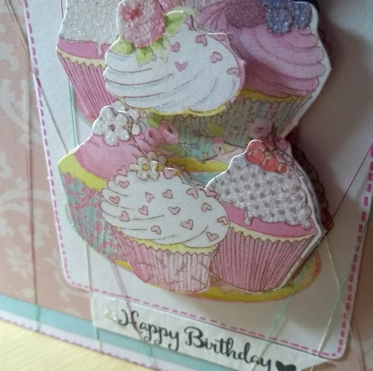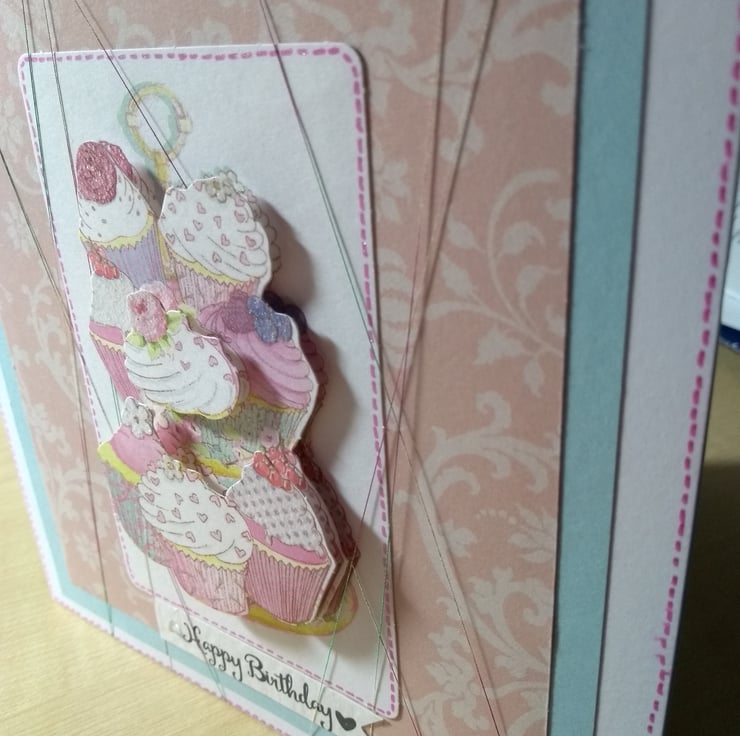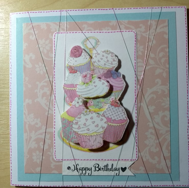 A completely handmade and uniquely designed card. Consisting of a loaded plate decoupage of cupcakes mounted onto white, pink patterned, blue then onto quality pristine white card. Happy birthday tag with rhinestone. Finished off with holographic thread