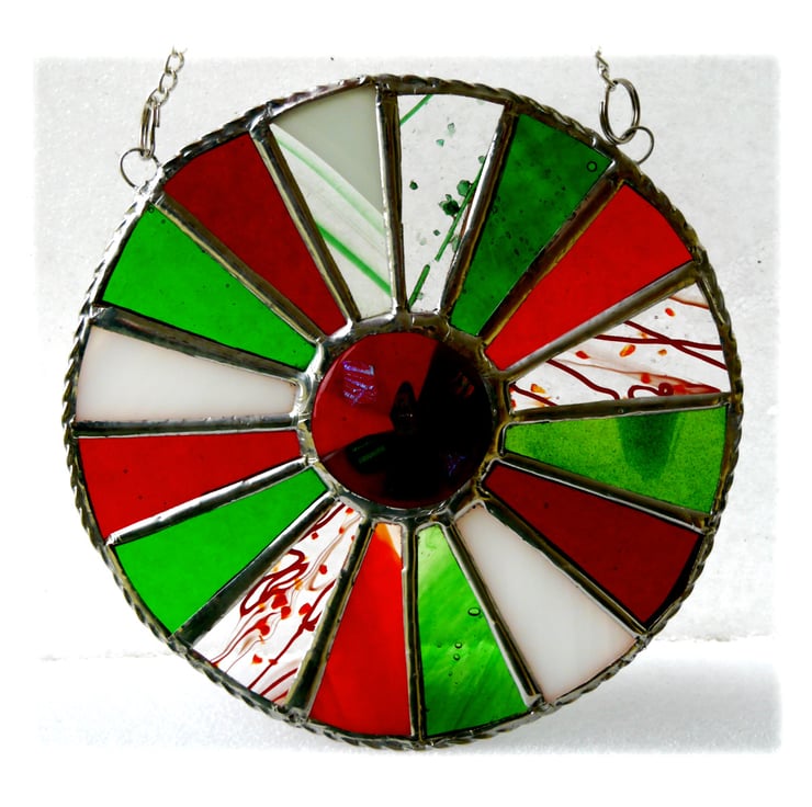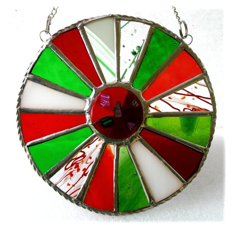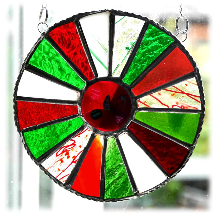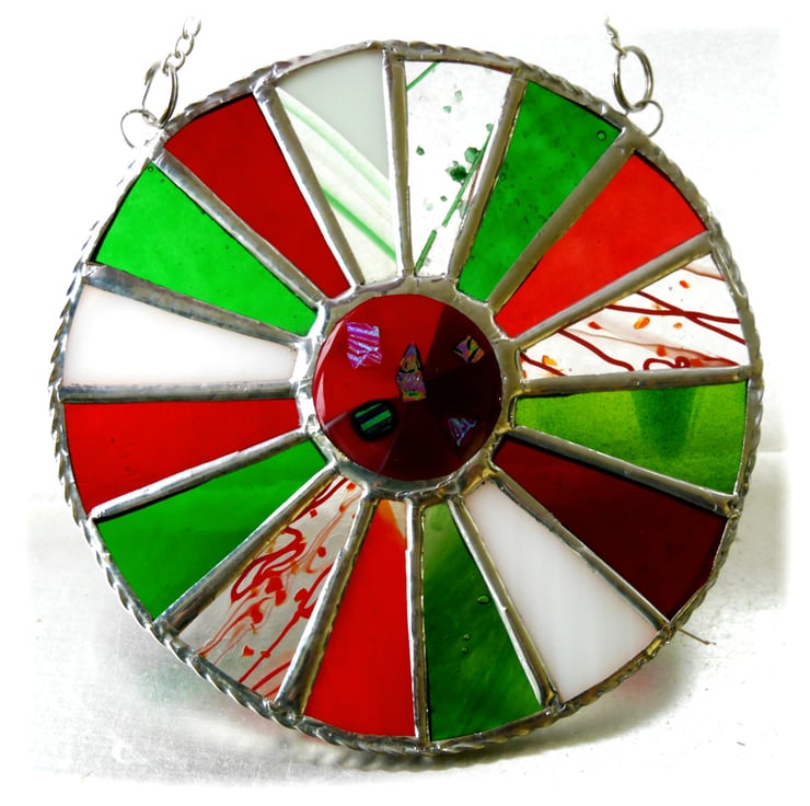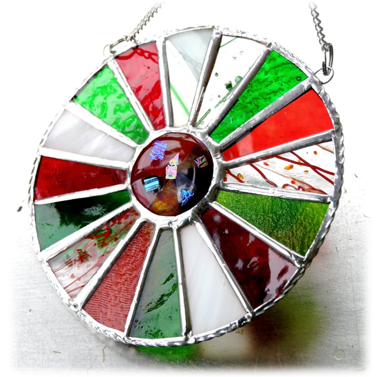 This is a stained glass suncatcher made using the Tiffany copper foil technique.