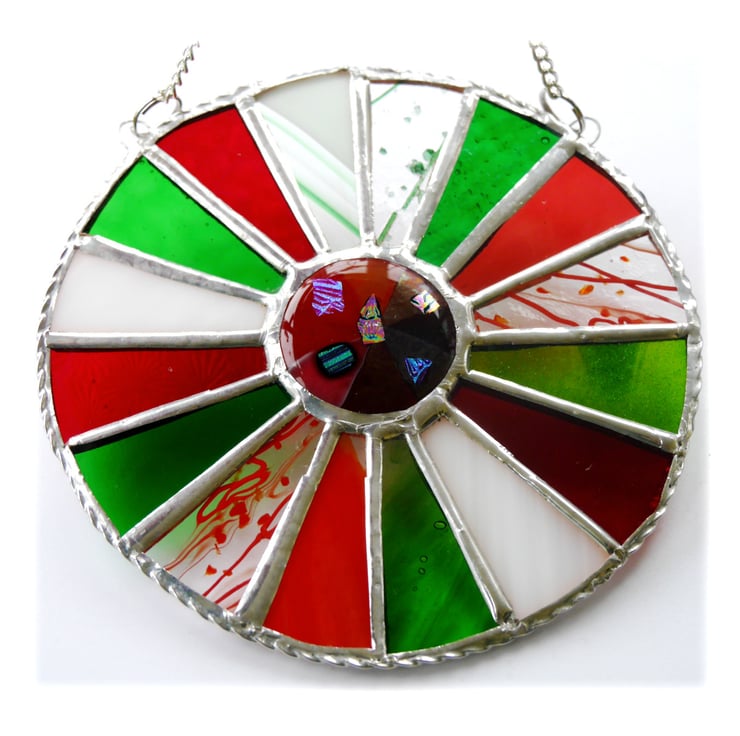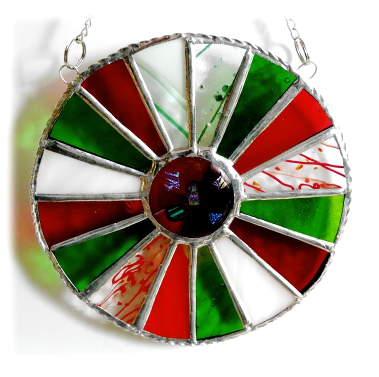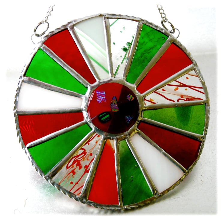 First of all I made a 4cm dichroic glass nugget in my hotpot kiln, bright red with dichroic sparkly bits. I've set this within 16 segments of red, white and green glass.