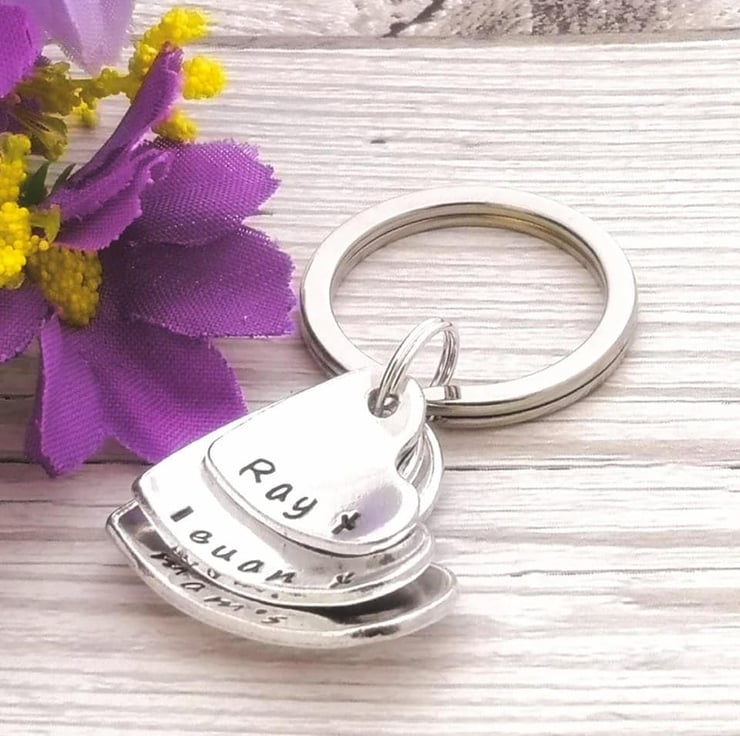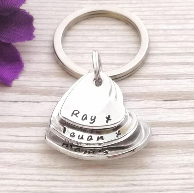 Personalise this stacked and domed three heart keyring with the names or words of your choice. A cute little gift for Mum, Gran or Aunt.