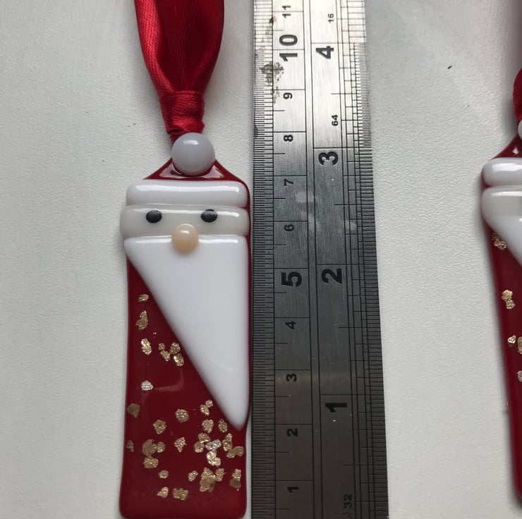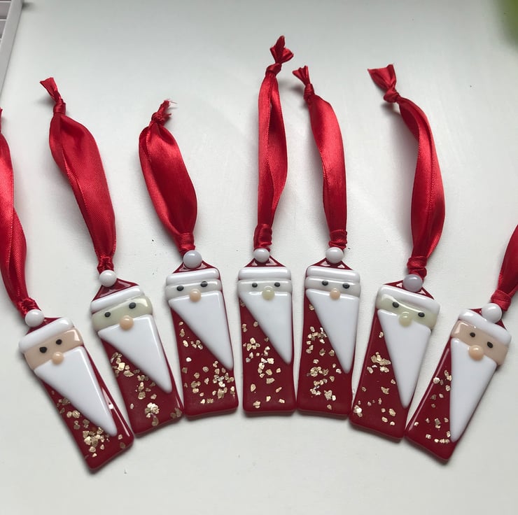 Hand created from sheet art glass in opaque red , skin colour and white these little Santa’s are light and easy to hang on even the smallest tree . They are textural and each Santa has a little bobble nose . They are approximately 3 inch long . They have wire hooks for hanging which are then hidden by the red satin ribbon