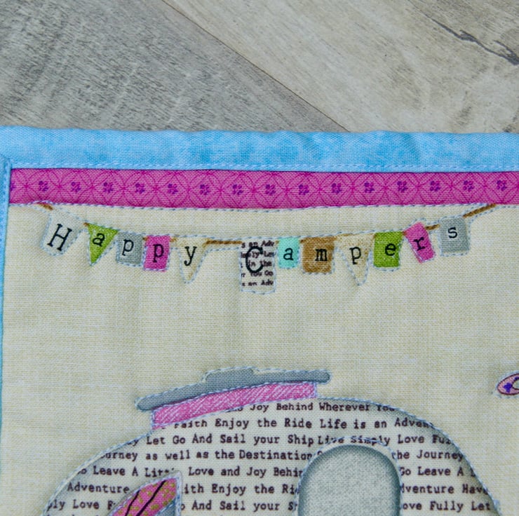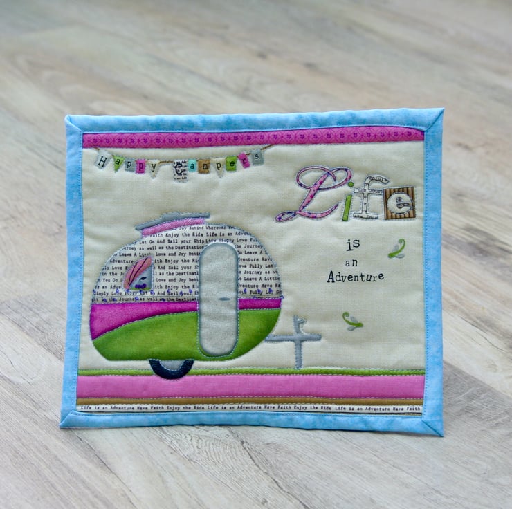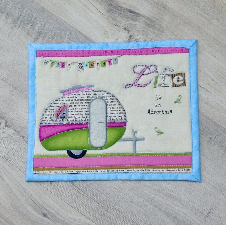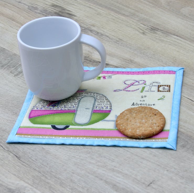 'Life is an Adventure' Mug Rug with Vintage Caravan Detail