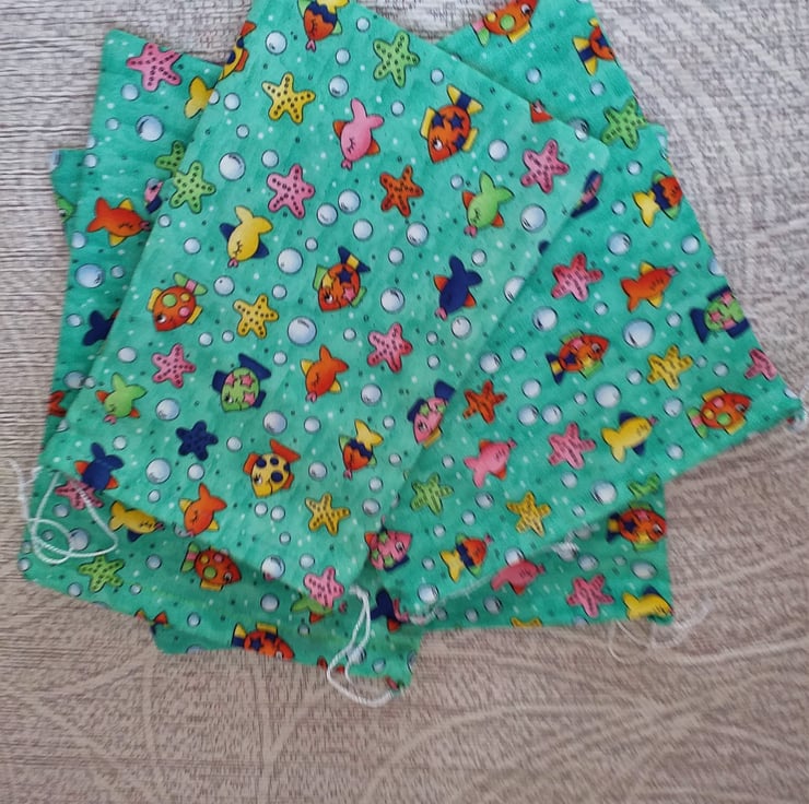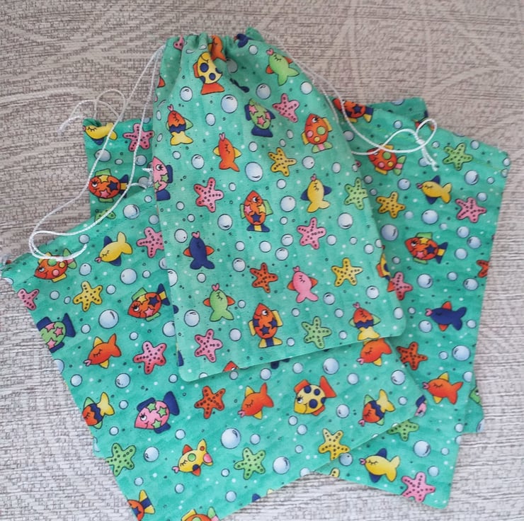 I have made up a pack of four pretty sea-green cotton bags of assorted sizes. Happy smiley gaily-coloured fish swim among the bubbles, interspersed with colourful starfish. These bags would be perfect for wrapping either Christmas or birthday presents for a child or an adult. They are 100% cotton, washable if necessary, and reusable, either for further wrapping, or as treasure bags, marble bags, even Scrabble letter bags! The largest measures 7" (18cm.) square.