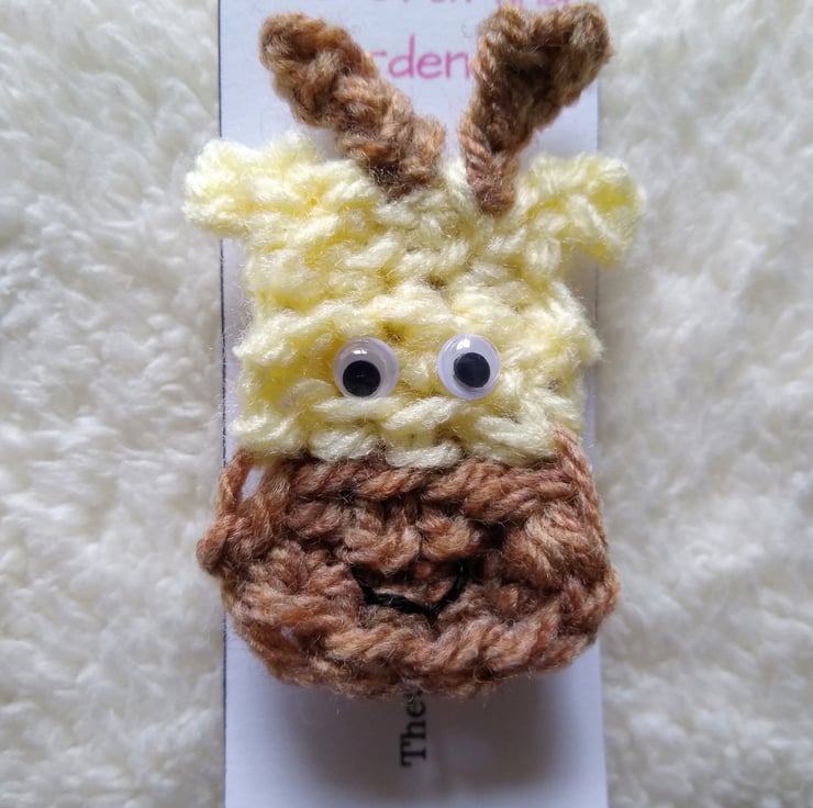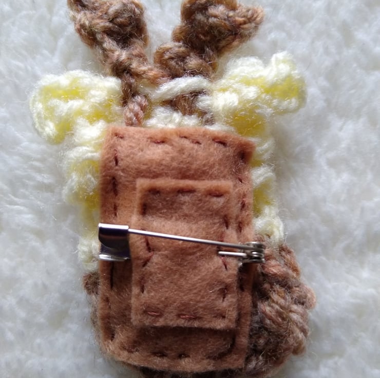 Cute animal lovers gift, this giraffe brooch is made from brown and pale yellow wool, dark brown wool facial features and cute googly eyes. She is wearing a bronze coloured ribbon. The brooch is backed by white felt, with the metal brooch pin sewn securely in place.