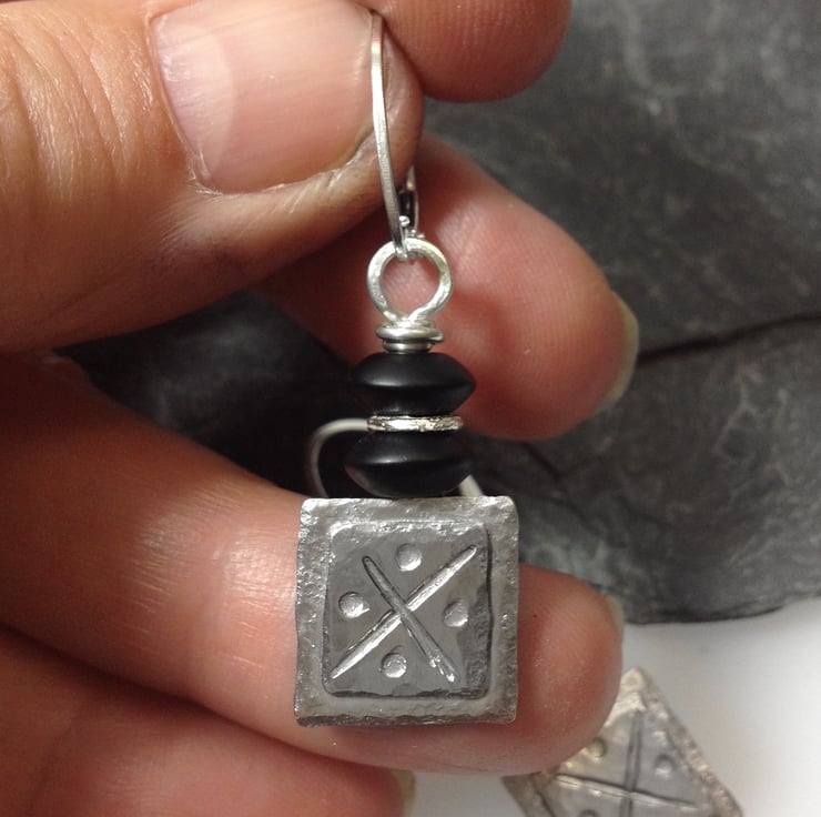 Squares of silver have been fused and a pattern added, these have been topped with a pair of black jasper rondel beads.