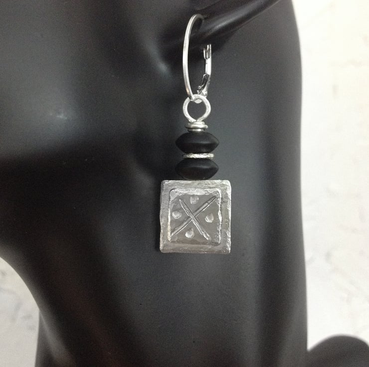 Black jasper and fused silver earrings with a tribal pattern.