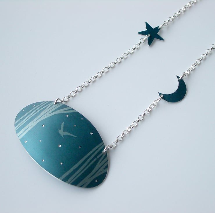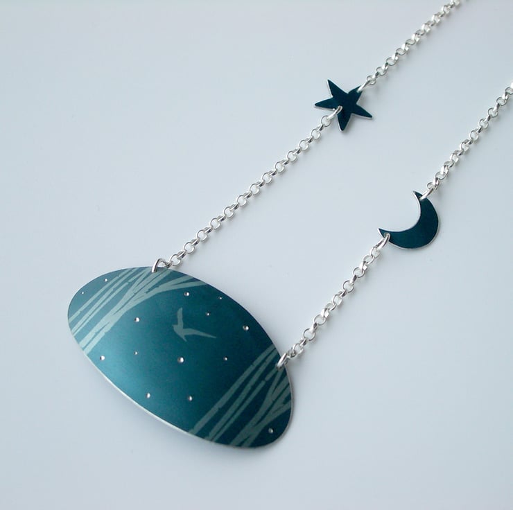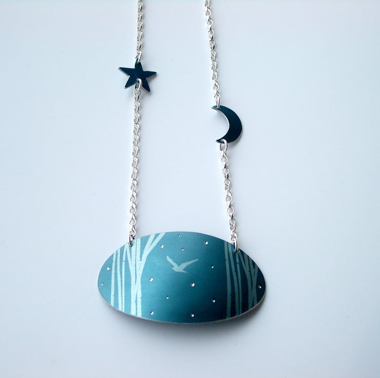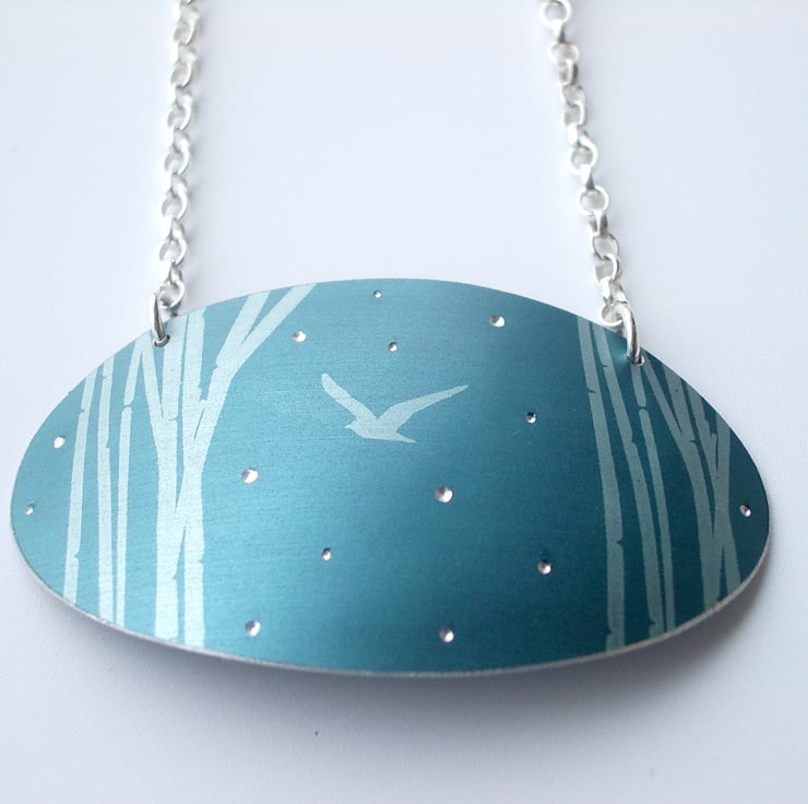 This oval teal pendant is made from anodised aluminium which I have hand dyed and printed with contrasting silver birch trees. The dye is made permanent through heat and becomes a part of the metal. I have also added sparkly dots which look like stars and printed a bird flying in the night sky. Finally I have filed the edges and domed the oval shape so that it catches the light.