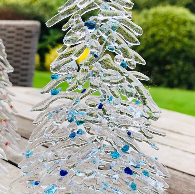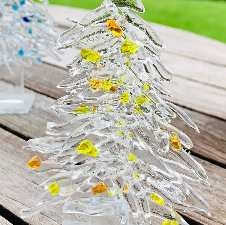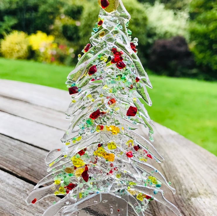 Set of 3 fused glass trees made using tiny pieces of fused glass and kiln fires for around 12 hours . They are on clear glass stands and as a set make a pretty and unique addition to your Christmas decorating