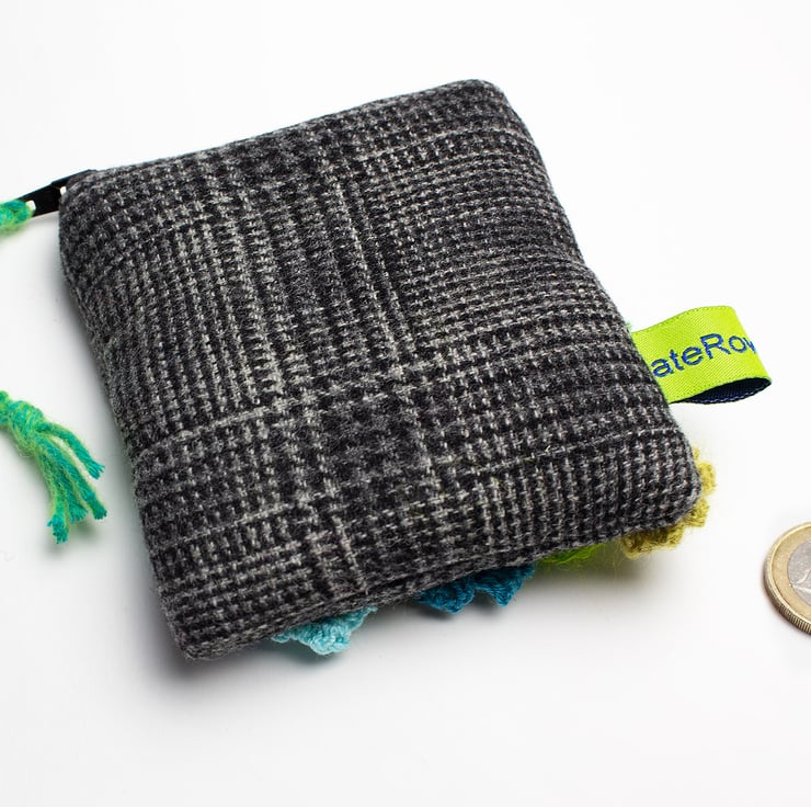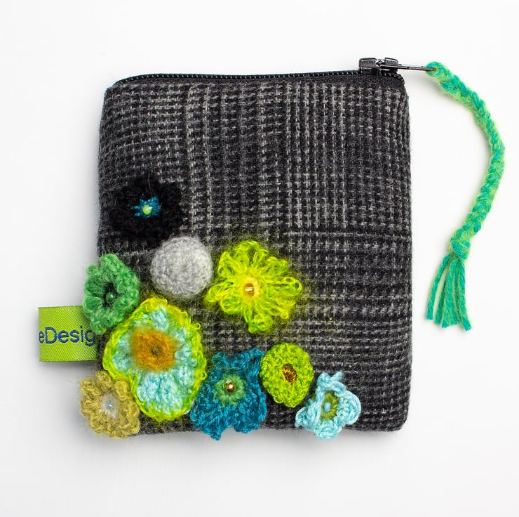 This little coin purse (3.5" by 3.5"/7cm by 7cm) has been made inPrince of Wales check suiting and decorated with hand crocheted flowers. The purse is fully lined and has a black zip and a plaited wool zip pull.