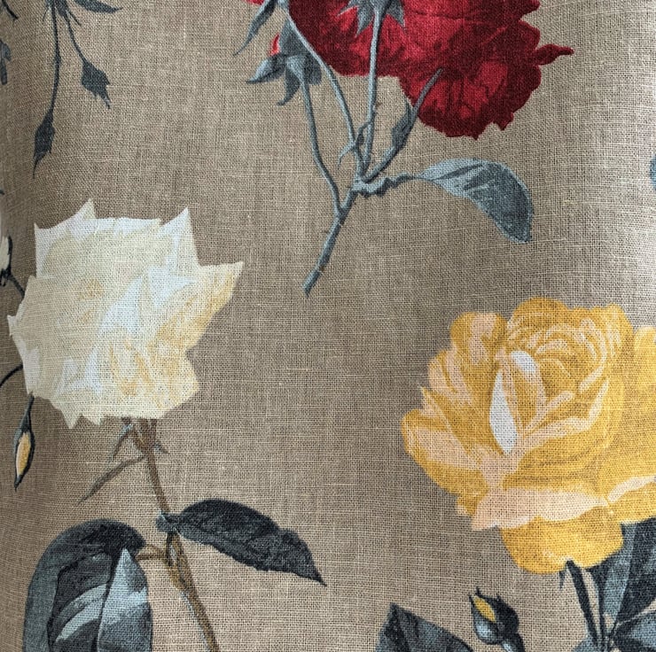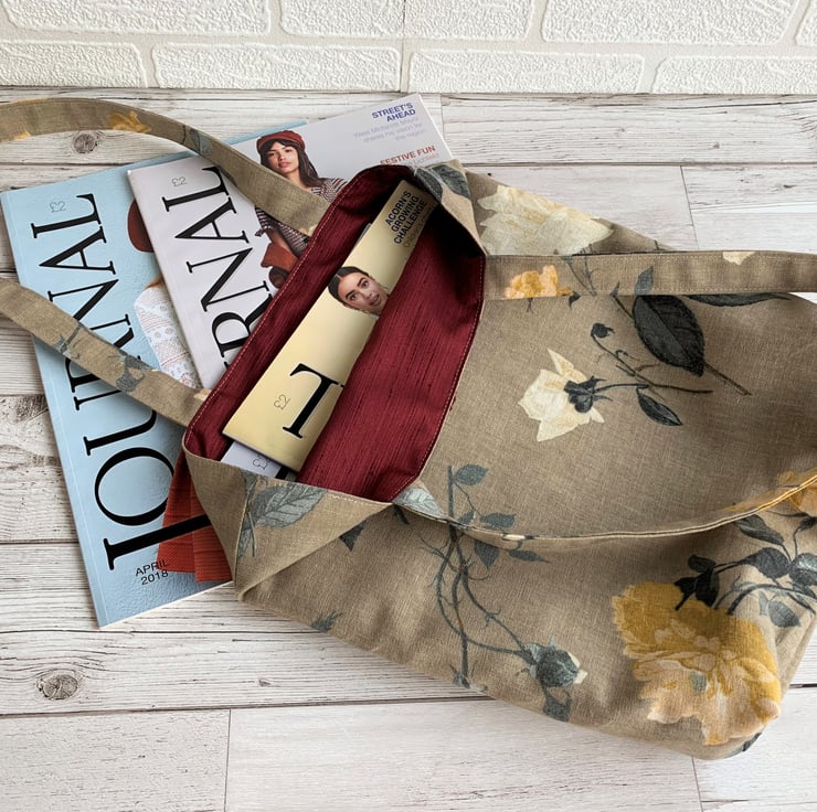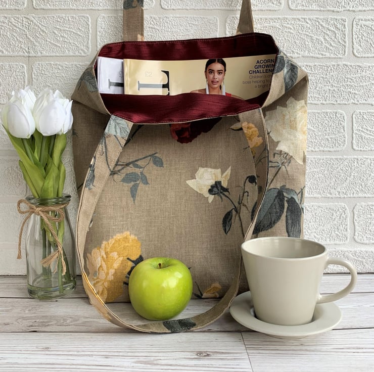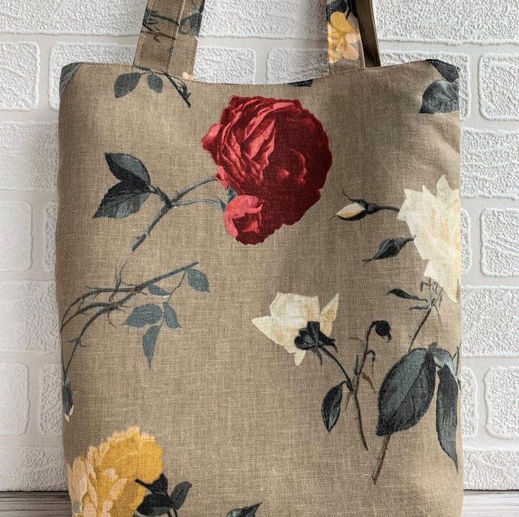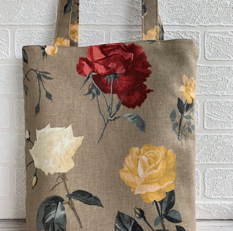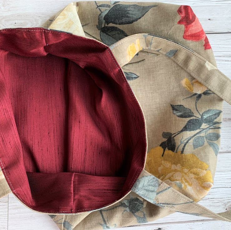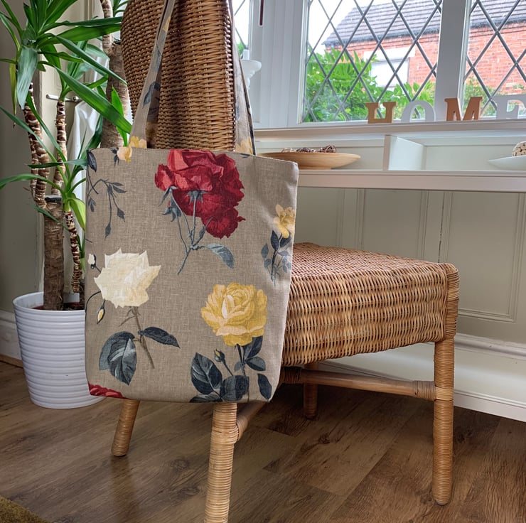 A pretty tote bag in a bold floral print fabric. The pattern features large stems of red, yellow and white roses and rosebuds with dark green stems and leaves on a beige background. The bag is lined with a co-ordinating dark red fabric with a slight sheen.