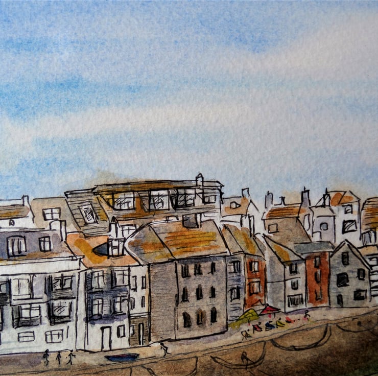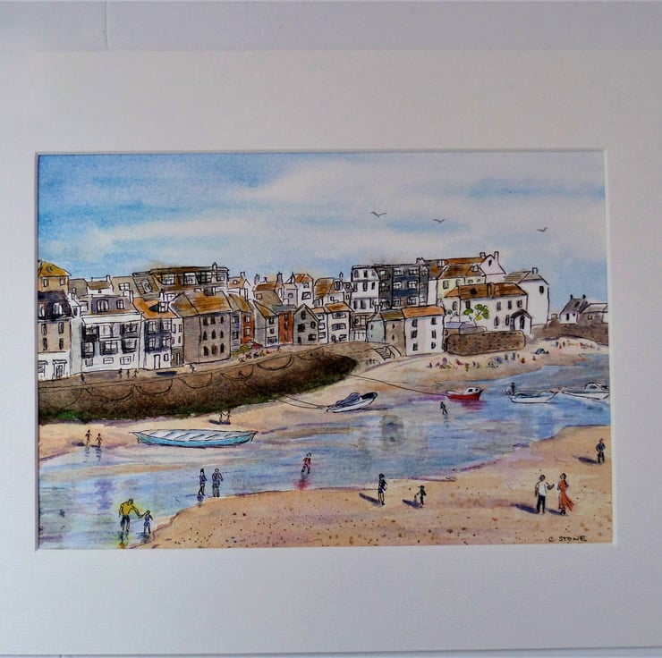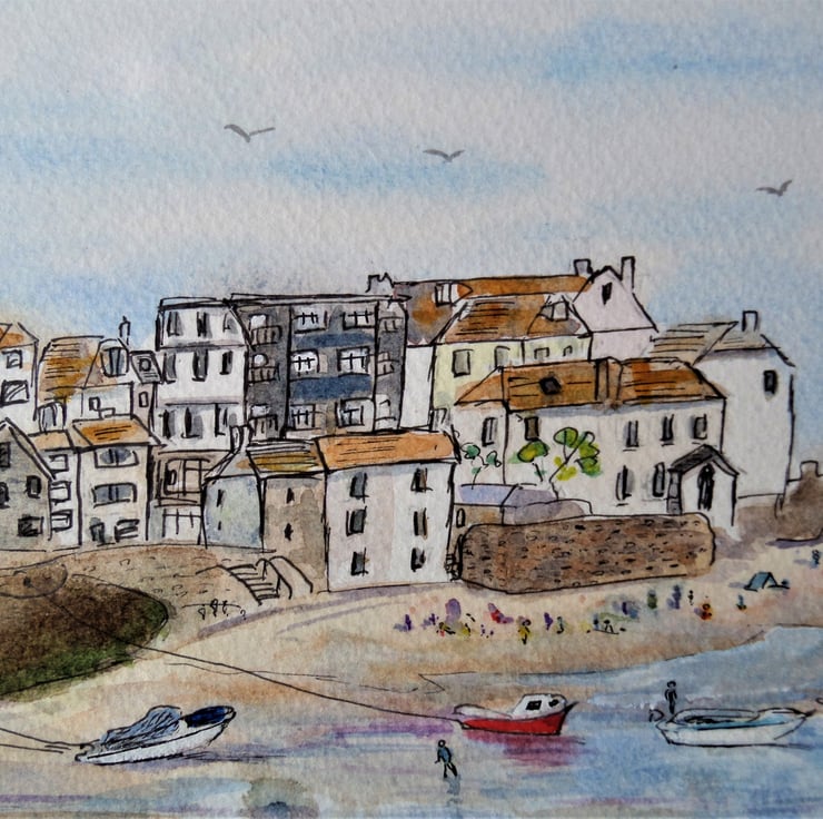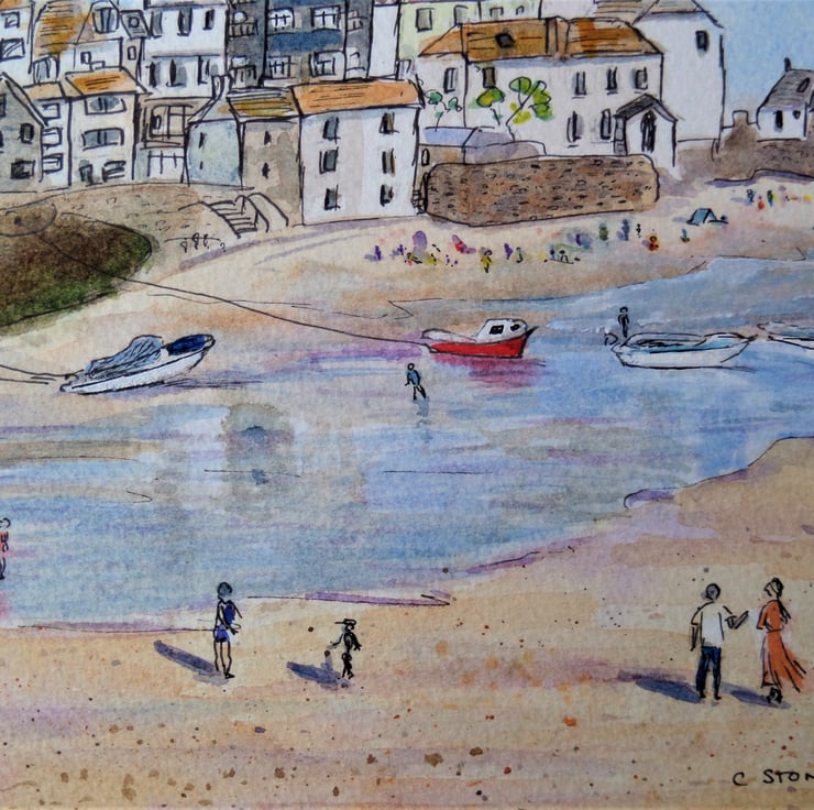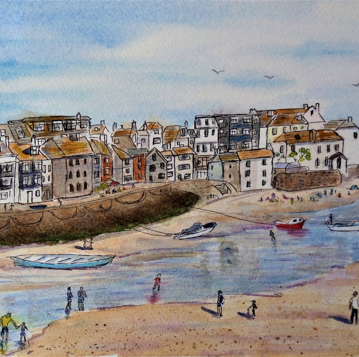My original watercolour "pen and wash" painting, of the harbour beach, in the lovely town of St.Ives in West Cornwall. Based on my own photograph, taken in early summer 2019.