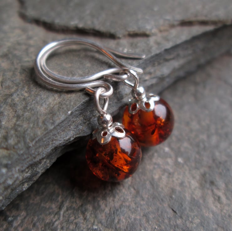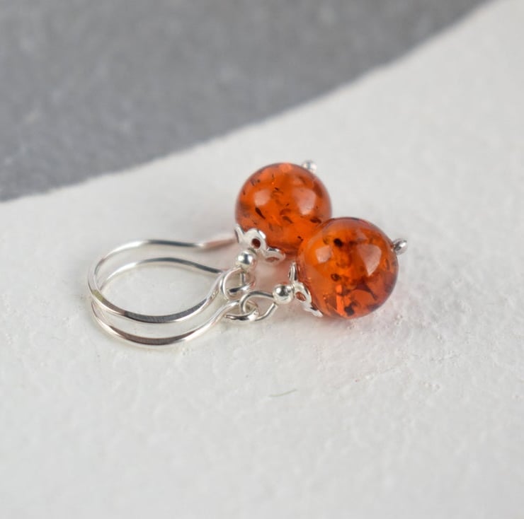 Amber drop earrings featuring beads of natural amber (8mm) hanging delicately from