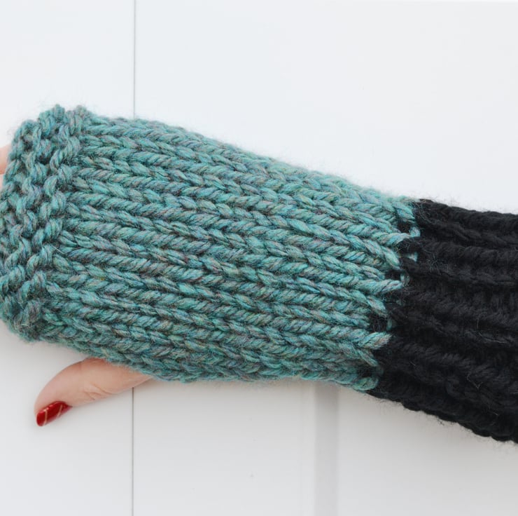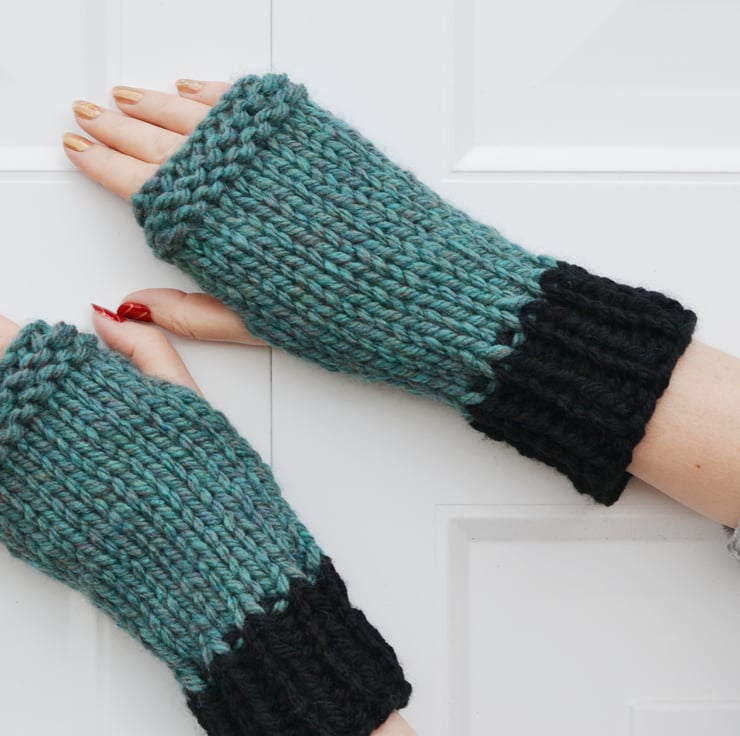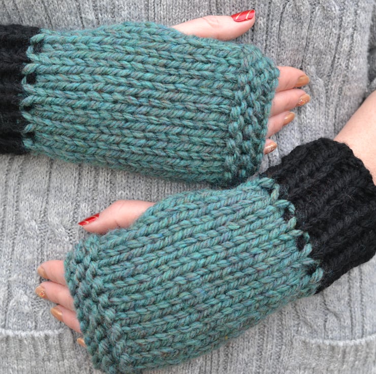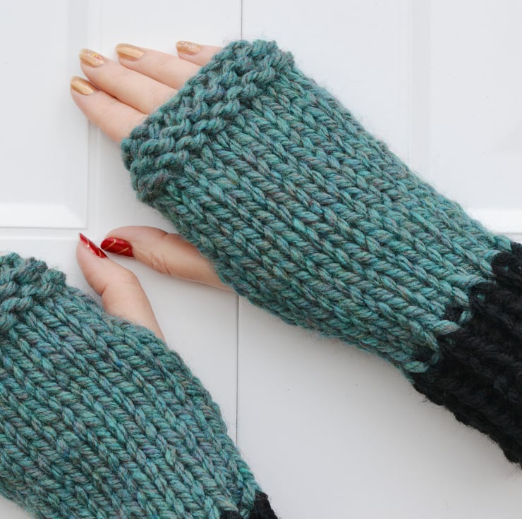 Hand knitted super chunky soft fingerless gloves. Knitted in a fir which has subtle undertones to the wool as shown in the photo's with a black ribbed cuff. Fits small/medium sized hands only. Lots more colours in my shop.