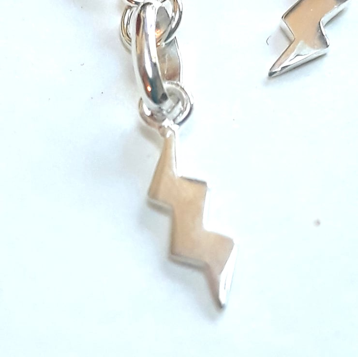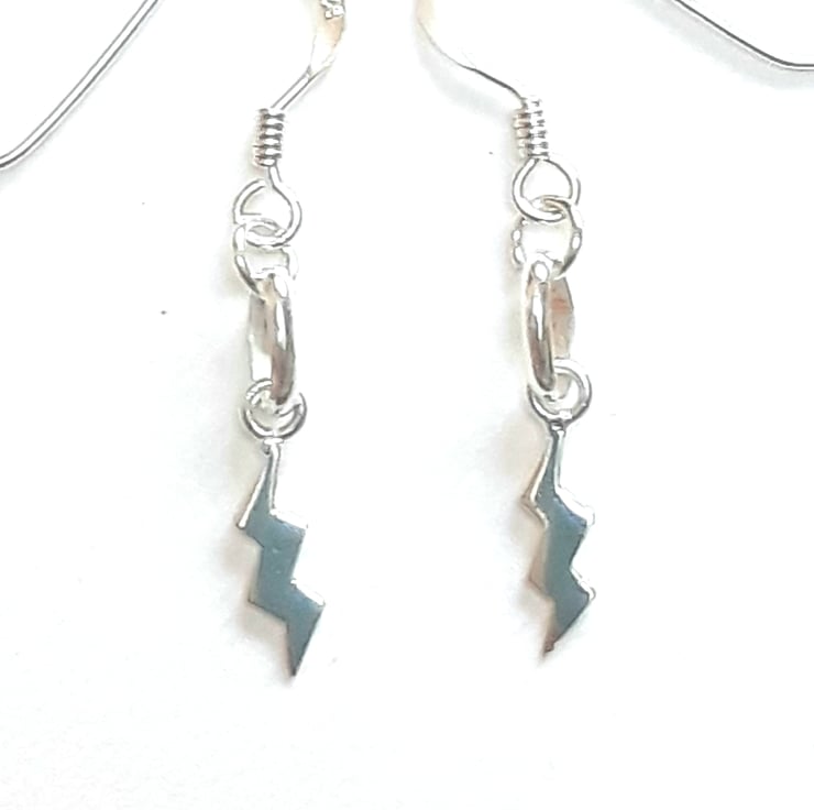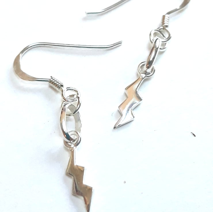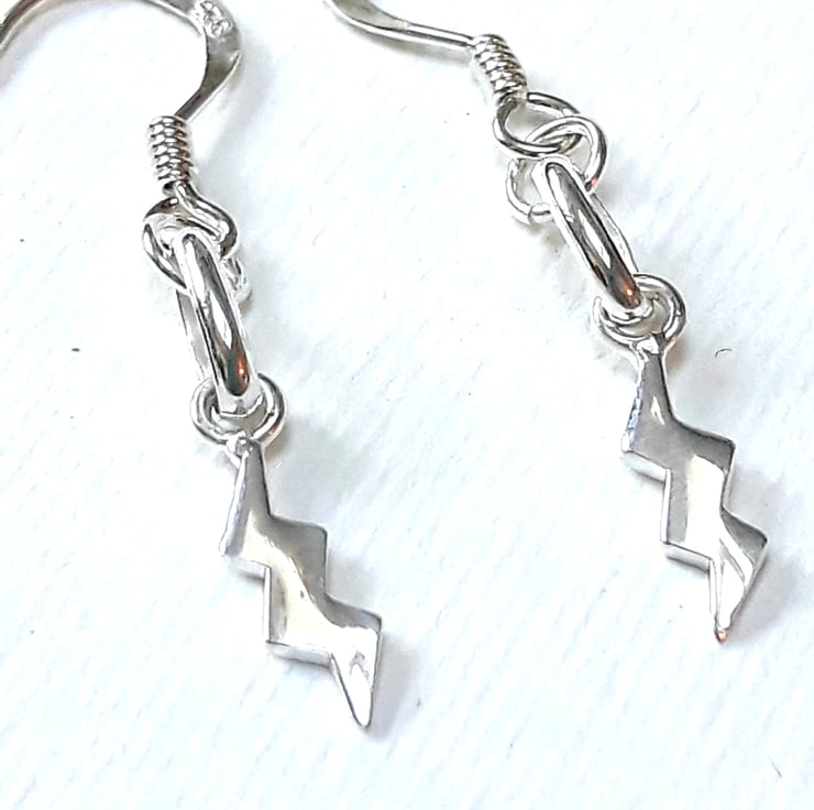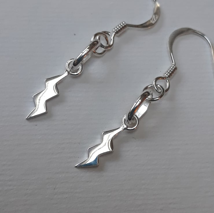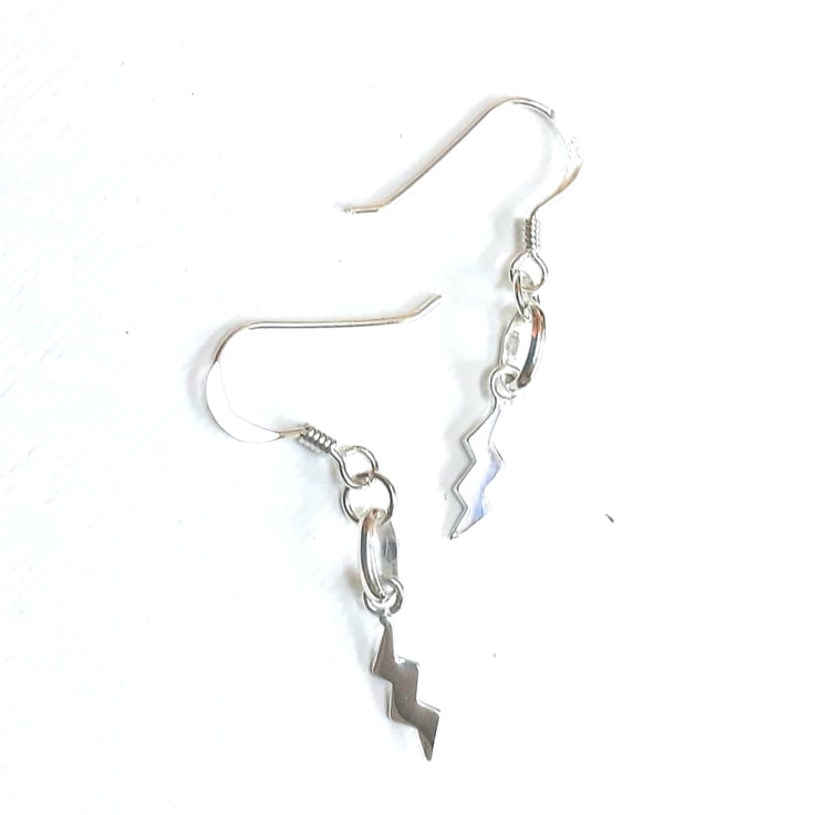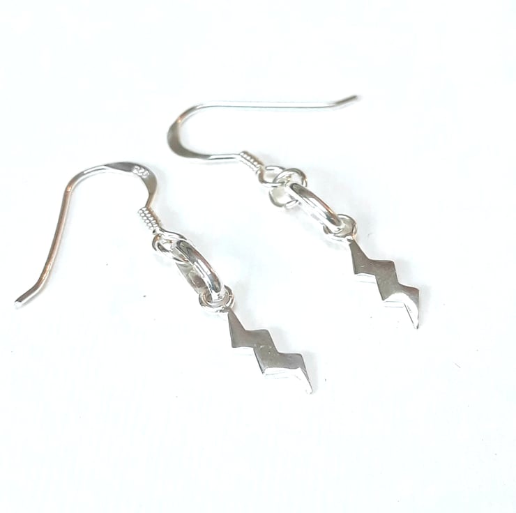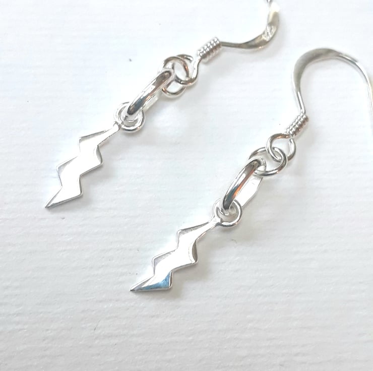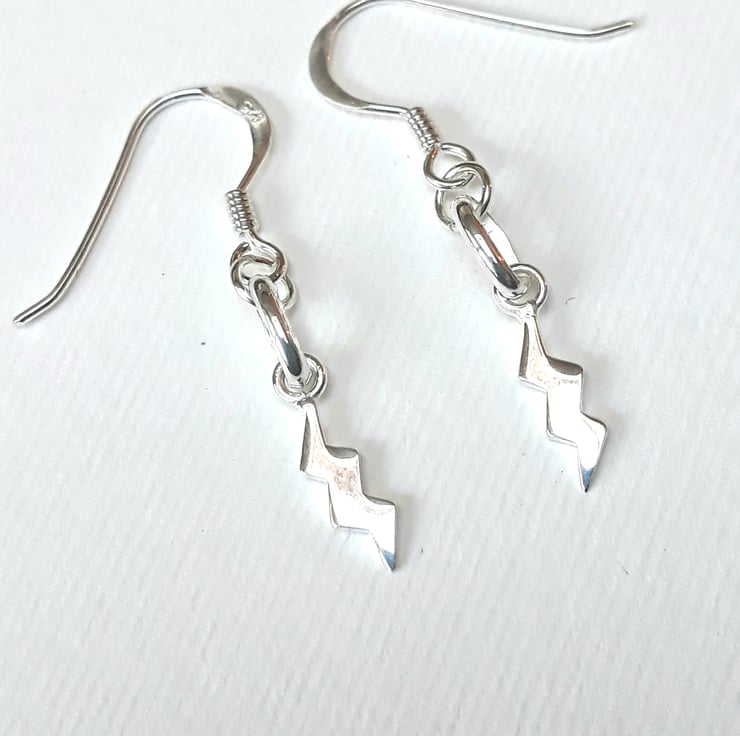 Small, shiny zig zag bolts of lightening hang from sterling silver ear hooks, suitable for day and night. Excellent for understated party wear. A lovely gift for followers of fantasy.