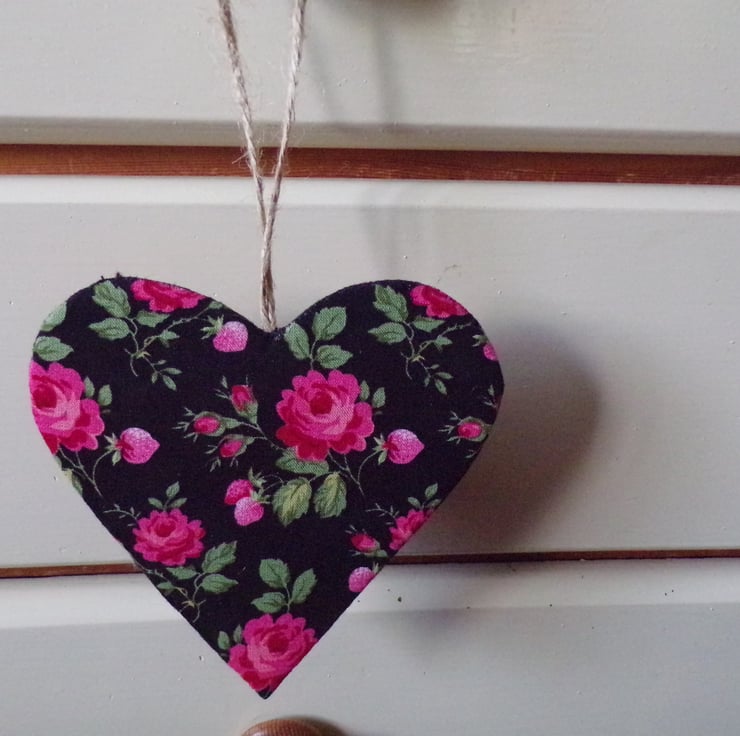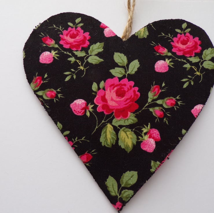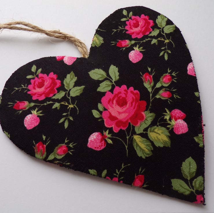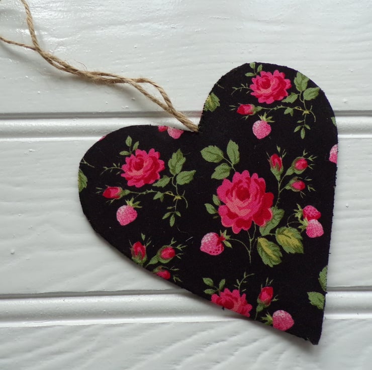 Decorative heart, heart wall hanging, heart decoration measuring approx. 13x13cm, it's in a lovely black fabric with a rose pattern and has a twine hanger. The heart is reversible and has a card inner to make it sturdy. It looks really pretty hanging on a wall, wardrobe handle, cupboard handle or on a door or to use as a decoration on a gift to your loved one, the choice is yours.
