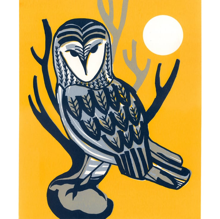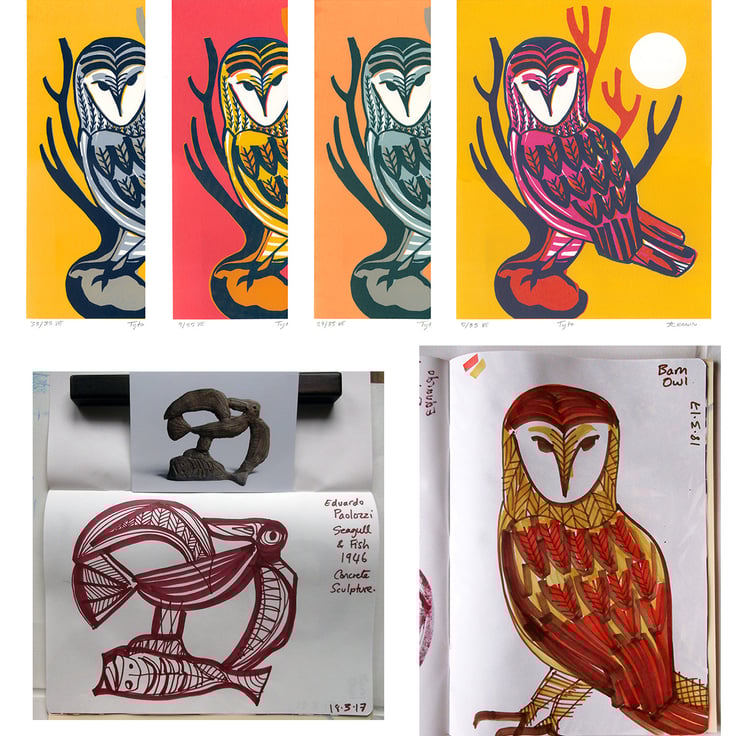 I am so pleased to finally list my 'Tyto' screenprints in my Folksy shop. The spark of inspiration for these prints came from the Eduardo Paolozzi exhibition at the Whitechapel gallery in 2017. I was attracted to his brutalist concrete sculpture Seagull & Fish; I tried to emulate the lines scored in the sculpture in a drawing of a barn owl. The concrete lines in the sculpture animate the bird and fish. The opposite is happening in my screenprint, the colours and forms capture the total stillness and silence of the owl as it focuses its gaze.