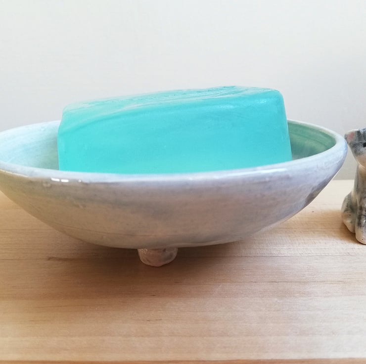 Hand thrown off the hump on my potter's wheel and altered to make cut out hole for drainage and little feet so no more soggy soap. Once bisque fired lead free glaze was applied prior to the second firing