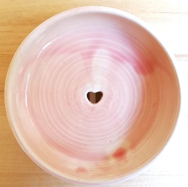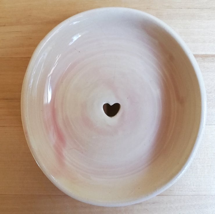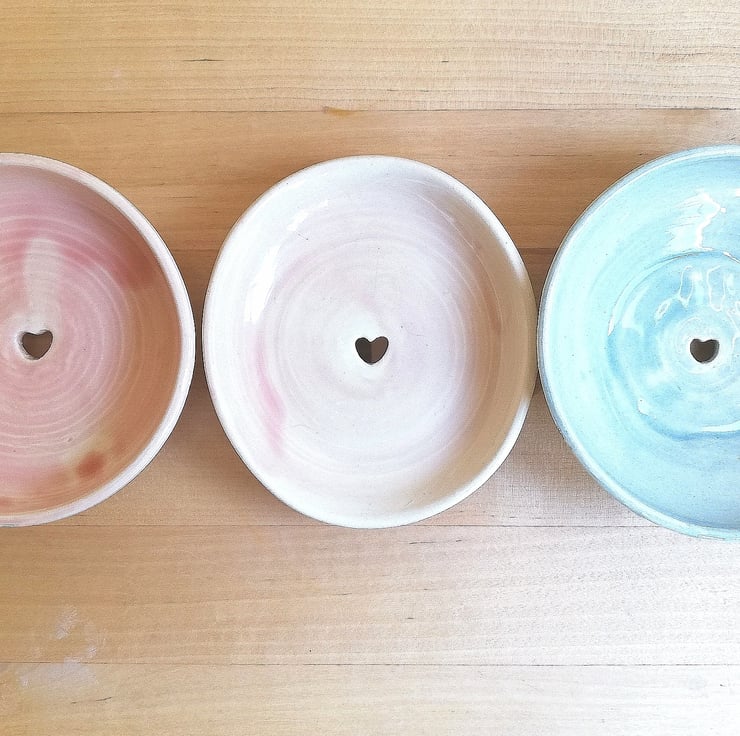 Hand made pottery soap holder with a choice of opaque glazes on white clay with little feet and heart shaped drainage hole. ONLY GREY OR LIGHTER PINK AVAILABLE.
