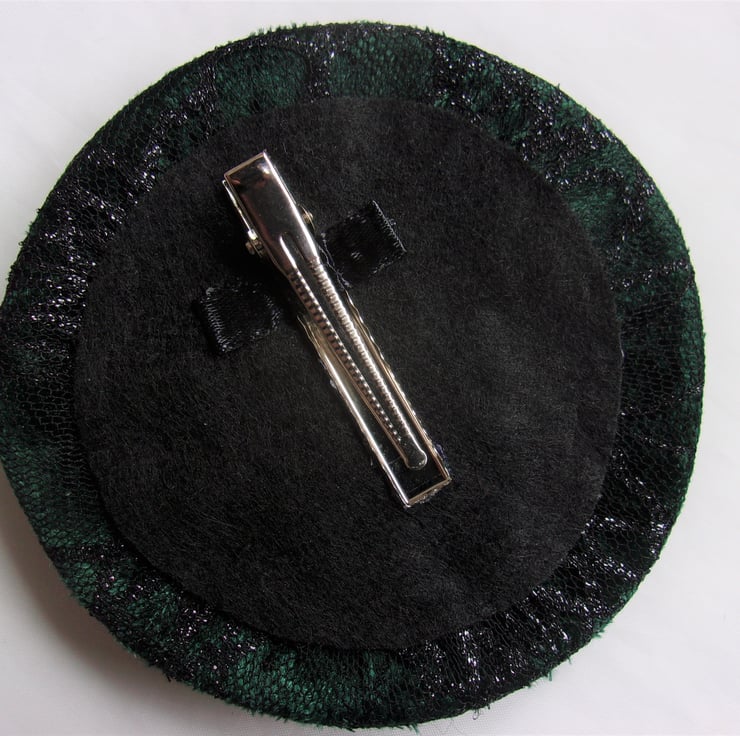 Covered again with a beautiful soft shimmering cobweb tulle fabric with a black circle of felt underneath with a metal croc clip for fixing.