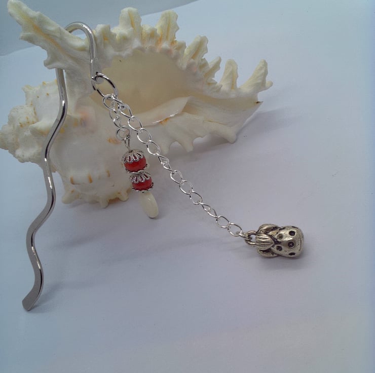 This pretty and practical silver plated bookmark would make an ideal gift for any book lover that you know, or a treat from yourself. The bookmark is silver plated and in the shape of a squiggle. It has 2 round pressed coral red beads with a white mother of pearl disc and silver plated bead caps and a silver plated strawberry charm suspended from a silver plated chain. The Bookmark is 8 cm in length. The bookmark will be dispatched wrapped in tissue paper in an organza bag and delivered to you via Royal Mail first class post.