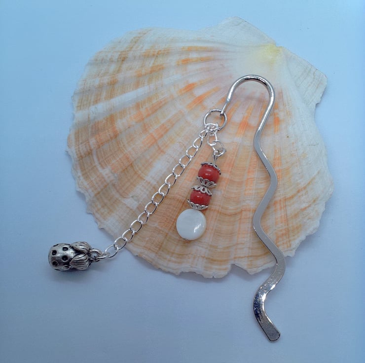 Silver Bookmark with Coral Bead and Mother of Pearl Beaded Charm and Silver Strawberry Charm, Reading Accessories, Teachers Gift, End of Term Gift, Thank You Gift, Bookmark