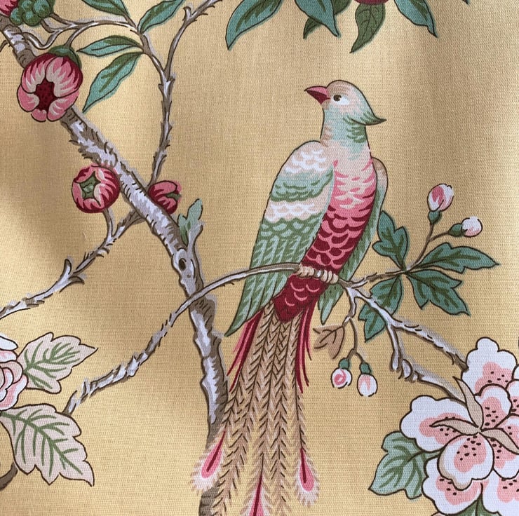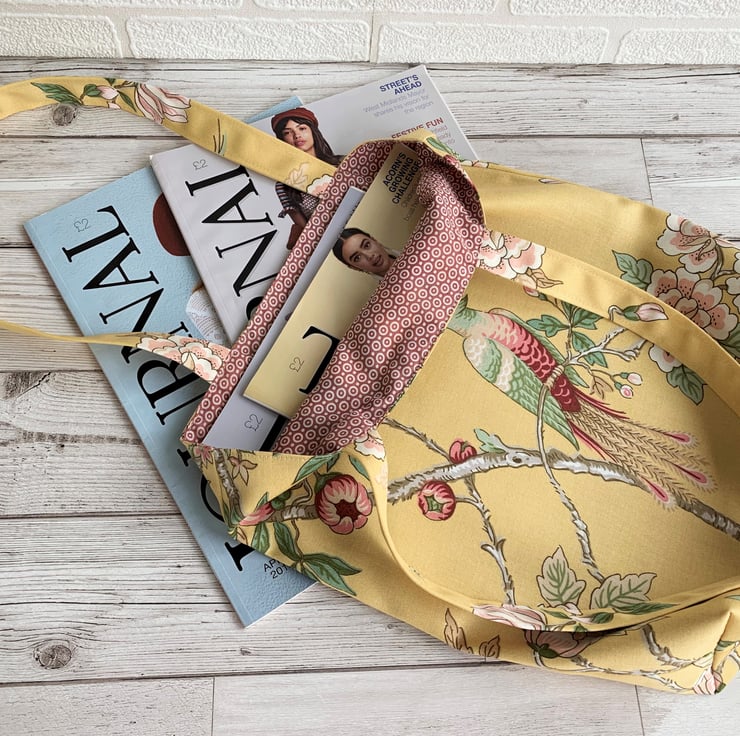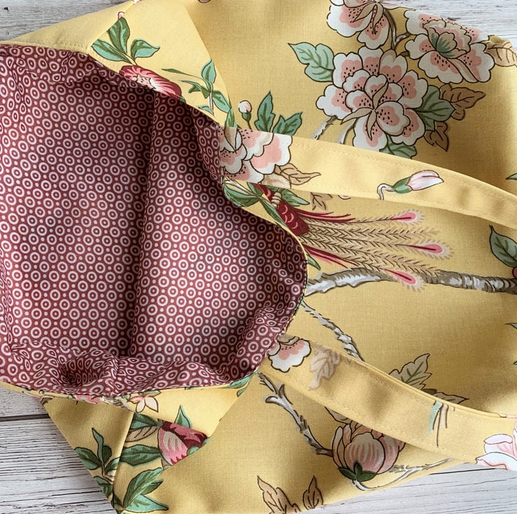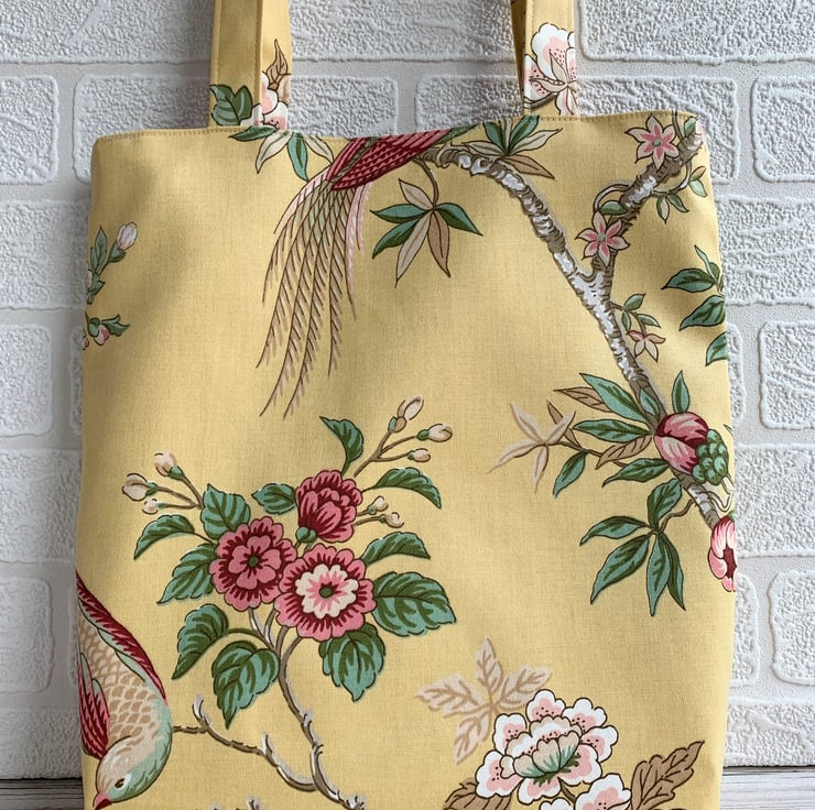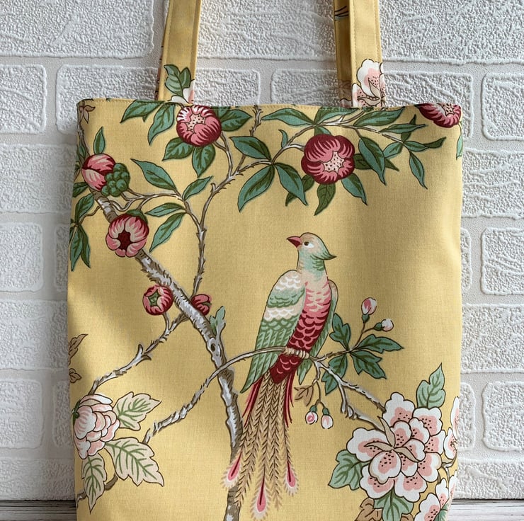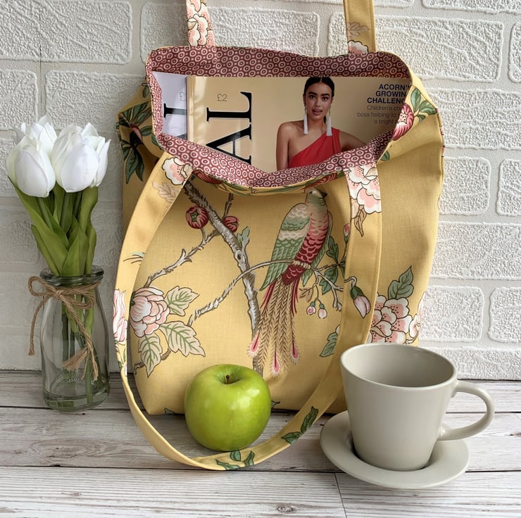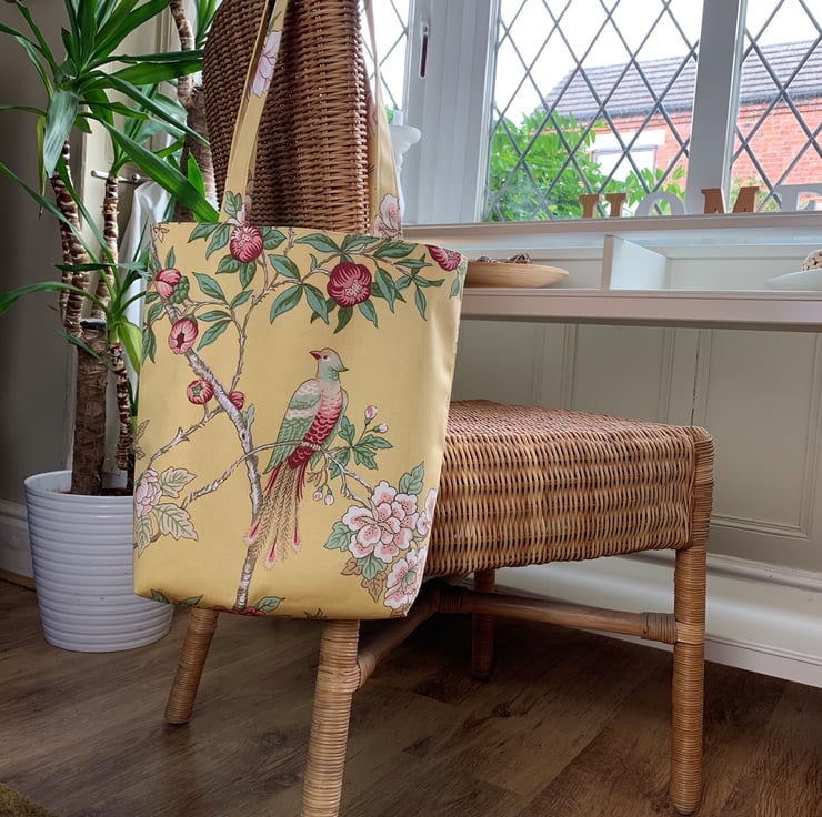 A pretty tote bag with an exotic print pattern in shades of pink, green, white and beige on a buttermilk yellow background. The pattern features an exotic bird sitting on a branch amongst exotic flowers. The bag is lined with pinkish-beige fabric with a pattern of small white circles and dots.