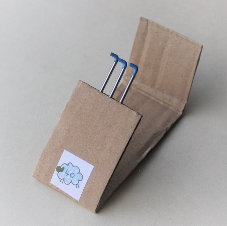 To reduce plastic, these needles are packaged in a recycled cardboard sleeve.