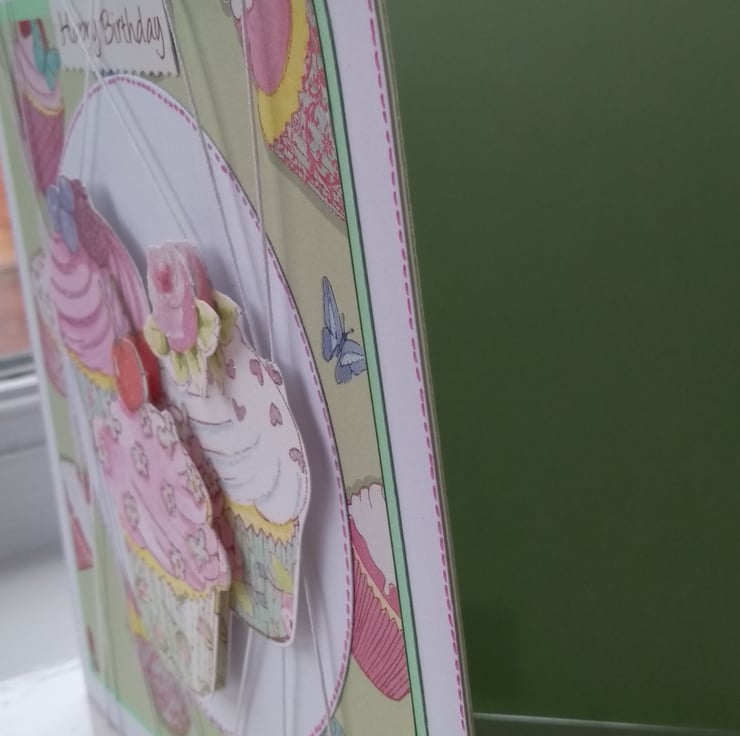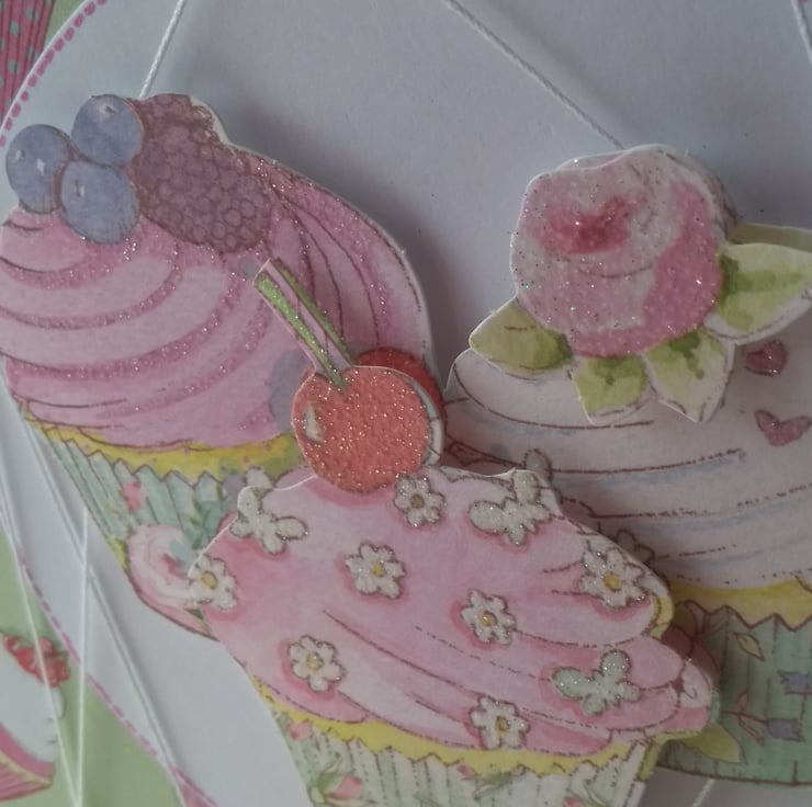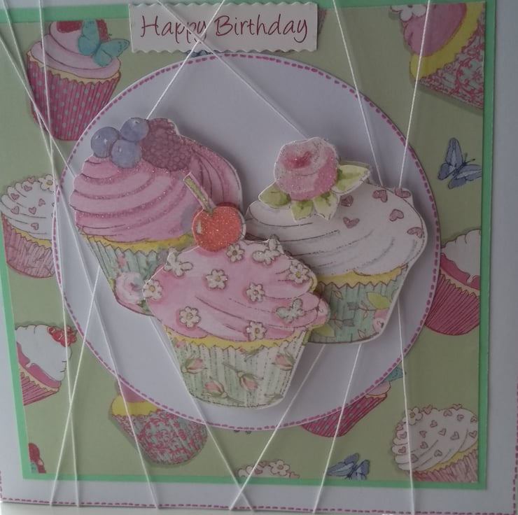 A completely handmade and uniquely designed card. Consisting of three cupcakes decoupage mounyrdy onto white, cake patterned, green then pristine white quality card. Frosted highlights. Wrapped in white cotton and happy birthday tag