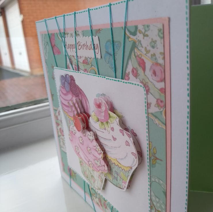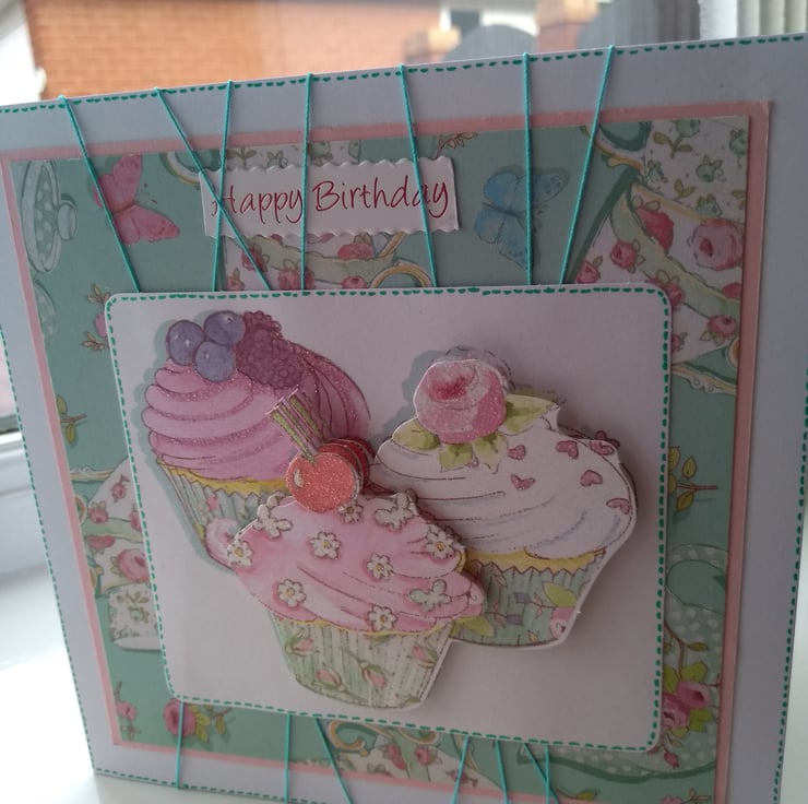 A completely handmade and uniquely designed card. Consisting of a trio of cupcakes decoupage. Mounted onto white, yes party patterned, pink and then pristine white quality card. Aquamarine twine wrapped and finished off with happy birthday tag. Frosted highlights.