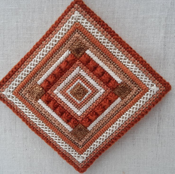 Small squares of copper leather have been sewn onto each tile.