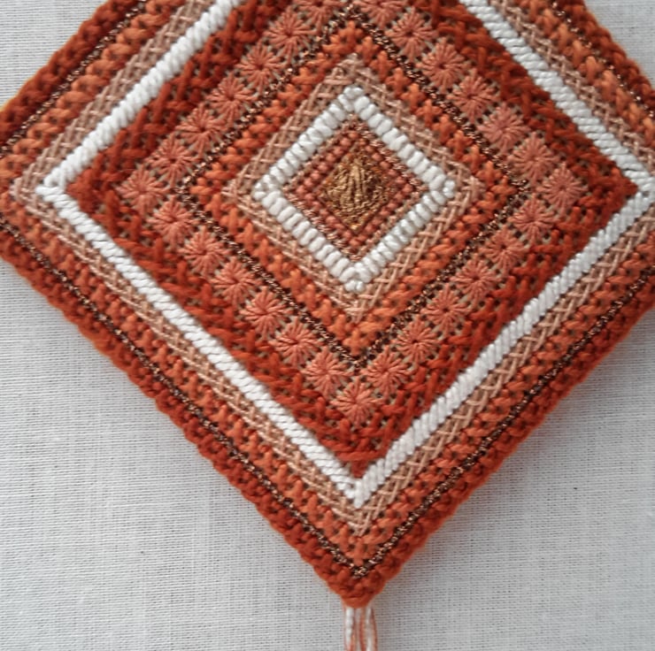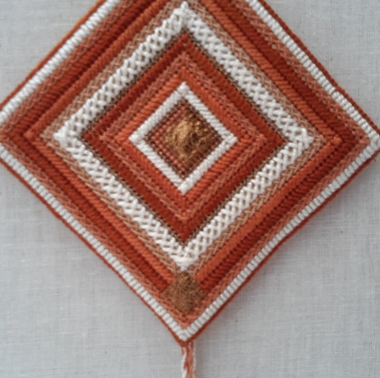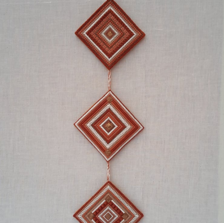 This is a unique triple needlepoint wall hanging designed by Bearlescent. Hand embroidered needlepoint tiles in russet, coppers and naturals with copper leather.