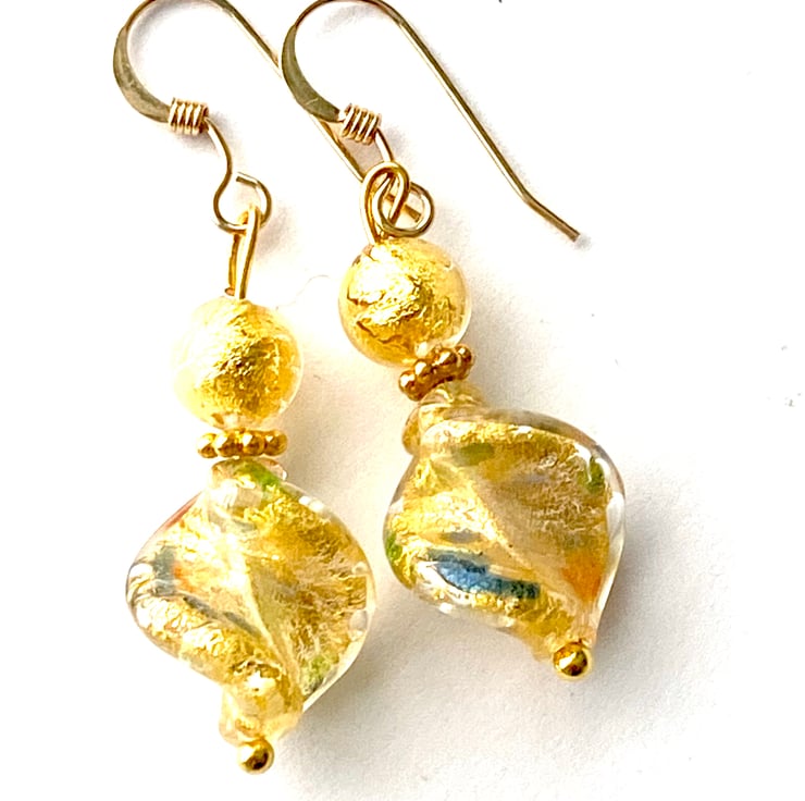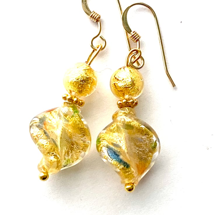 A gorgeous pair of Murano glass earrings with gold foiled Elica gold twisty Murano glass beads with gold foiled gold Murano glass round beadsThese lovely gold beads are flecked with red and blue and hang from gold filled gold hooks. The earrings measure 25mm in length excluding hooks and are presented in a velvet gift bag.
