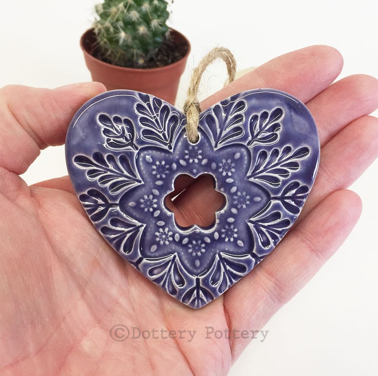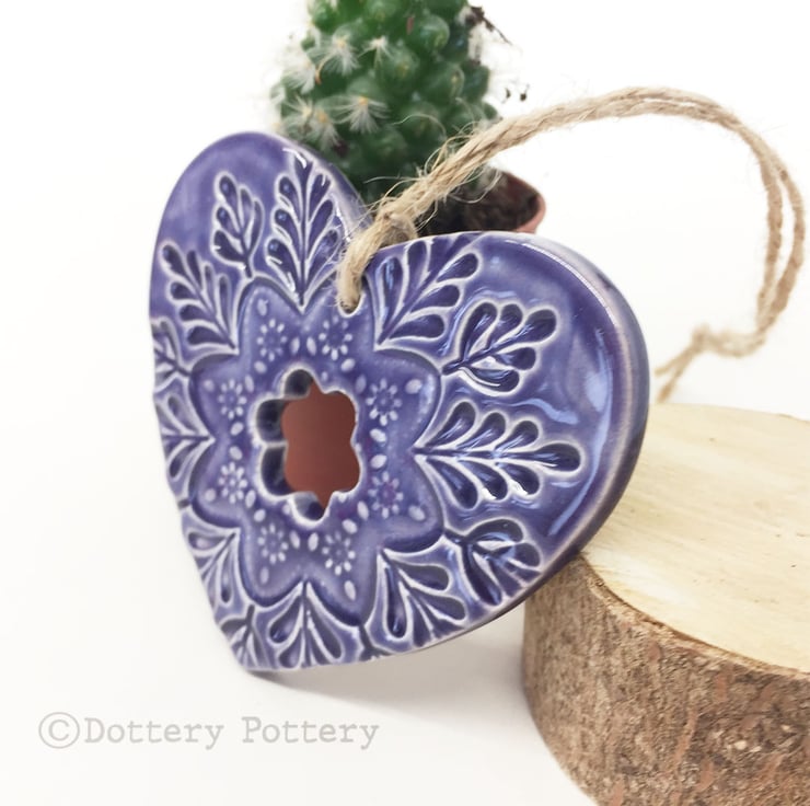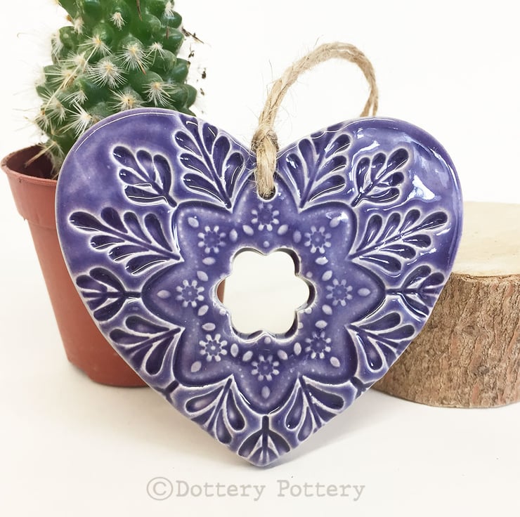This listing is for ONE PURPLE ceramic heart. made from white earthenware clay, imprinted with pattern and finished with a bright, glossy glaze. It has been fired twice, once to the bisque stage and then a second firing for the glaze. It measures 10 centimetres wide and the same in height x 5mm thick. It can be hung outside.