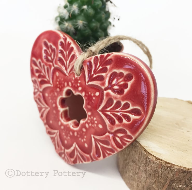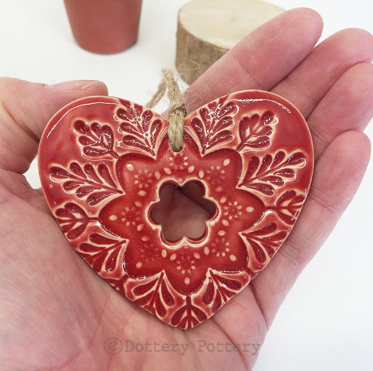 This listing is for ONE RED ceramic heart. made from white earthenware clay, imprinted with pattern and finished with a bright, glossy glaze. It has been fired twice, once to the bisque stage and then a second firing for the glaze. It measures 10 centimetres wide and the same in height x 5mm thick. It can be hung outside.