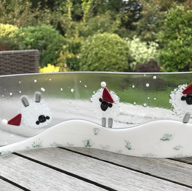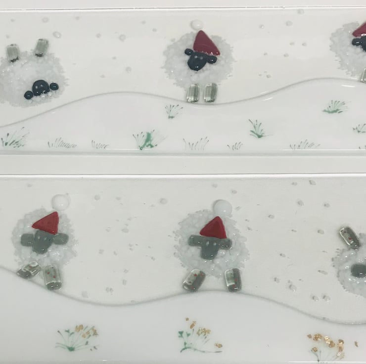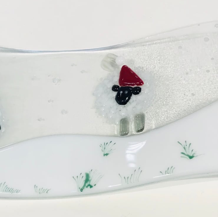 Cute and quirky fused glass stand up wave . They sheep design with one rolling down the hill . Designed to stand on a window sill or shelf . Will make you smile . It takes two kiln firings of approximately 24 hours and all elements are hand cut and made by me in my studio
