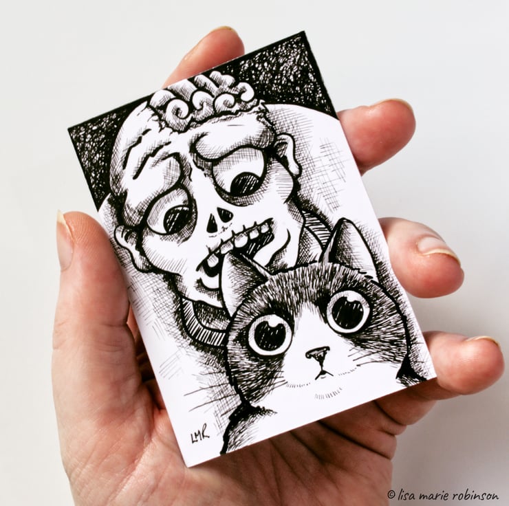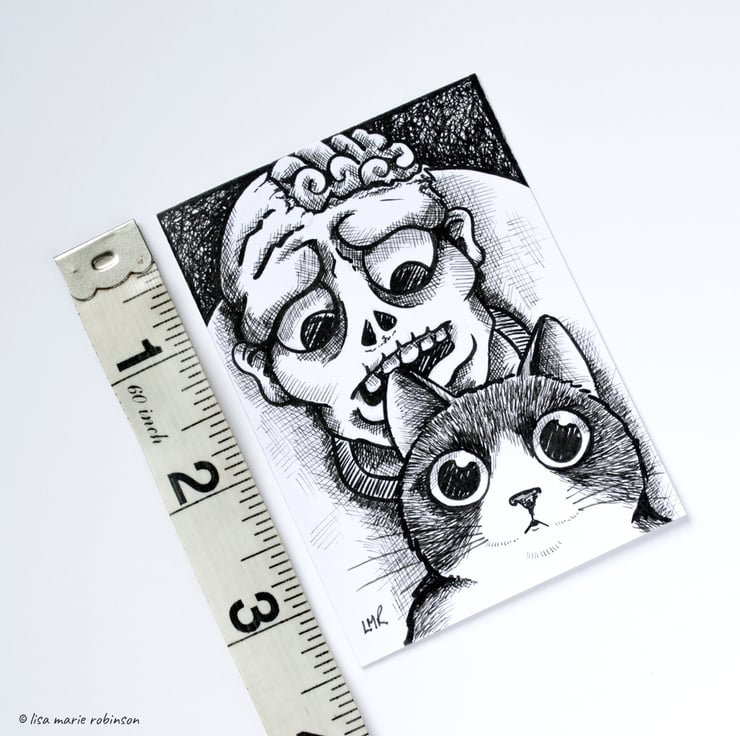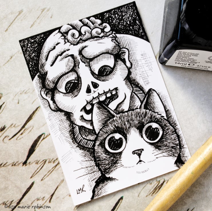 Fun drawing featuring a slightly scared tuxedo cat being crept up on my a mindless zombie. Drawn as part of the Inktober 2019 social media drawing challenge.