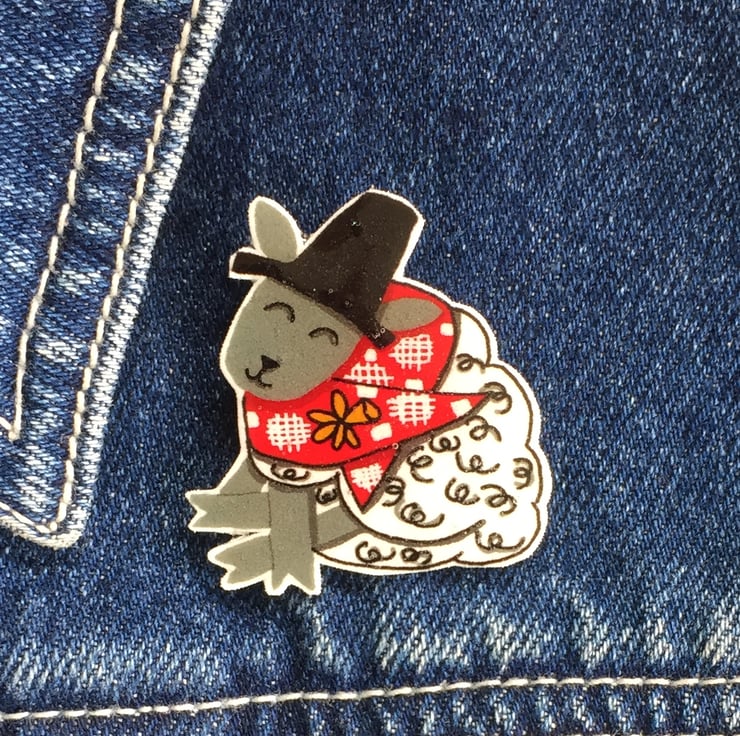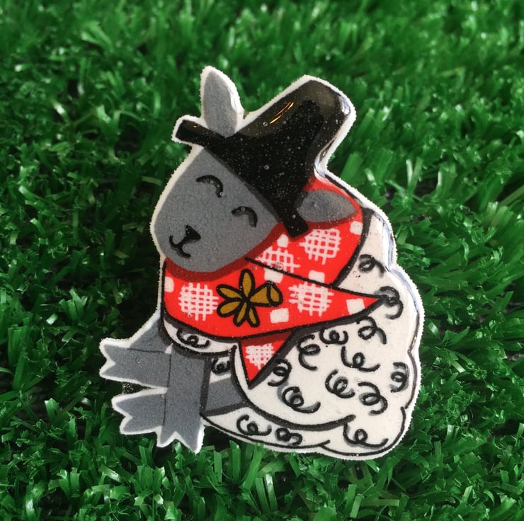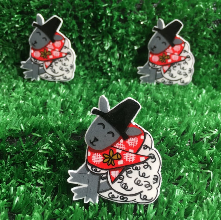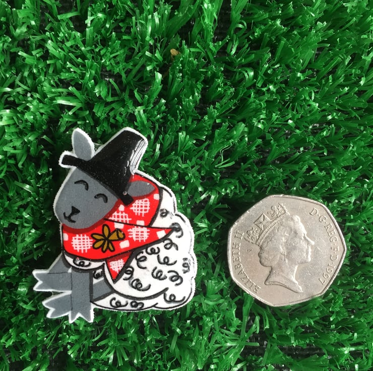 My happy cute little Welsh Sheep Pin is taken from one of my original drawings. He is wearing a traditional Welsh Hat with a red scarf in a traditional Welsh weave pattern, which is secured with a little daffodil and he would look perfect worn on a jacket or a bag and forms part of our Welsh Collection of Pins.