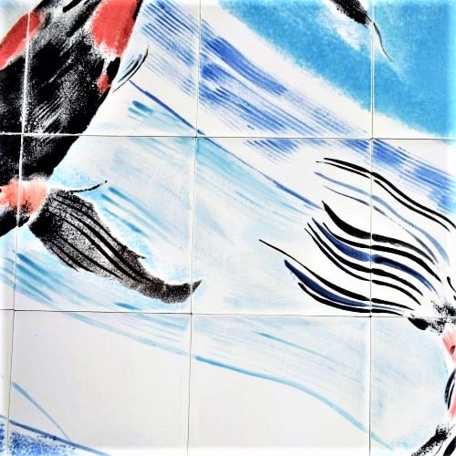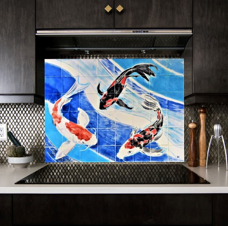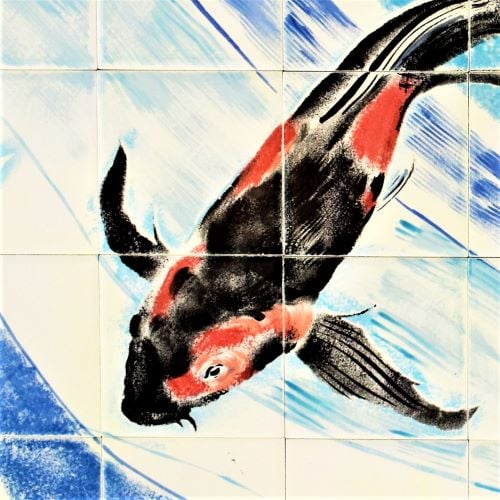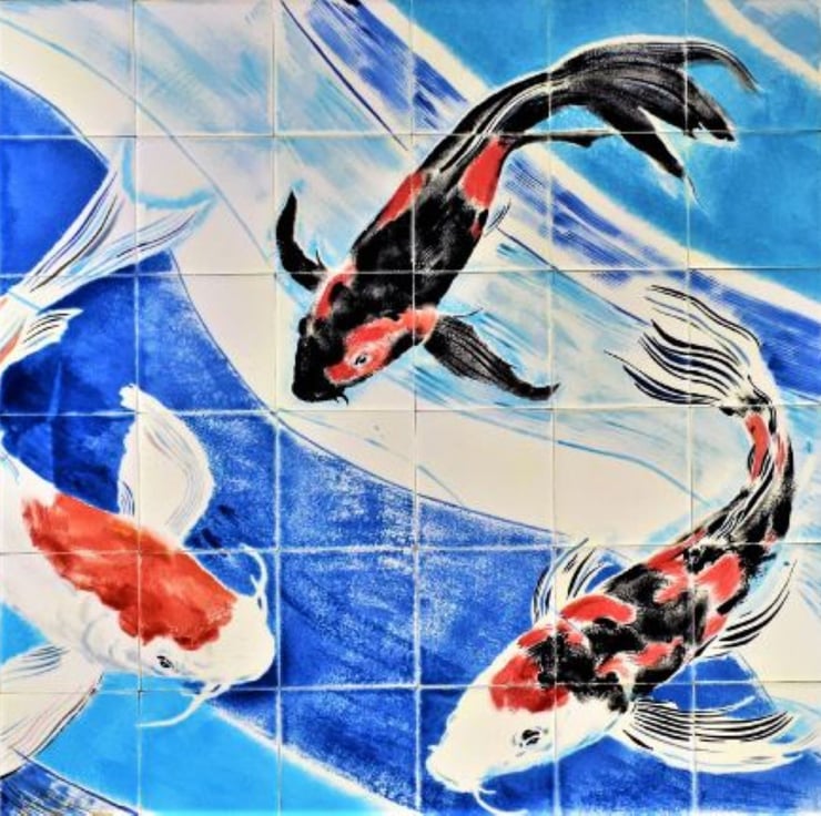 An original hand-painted ceramic tile mural, with three beautiful Koi carp.