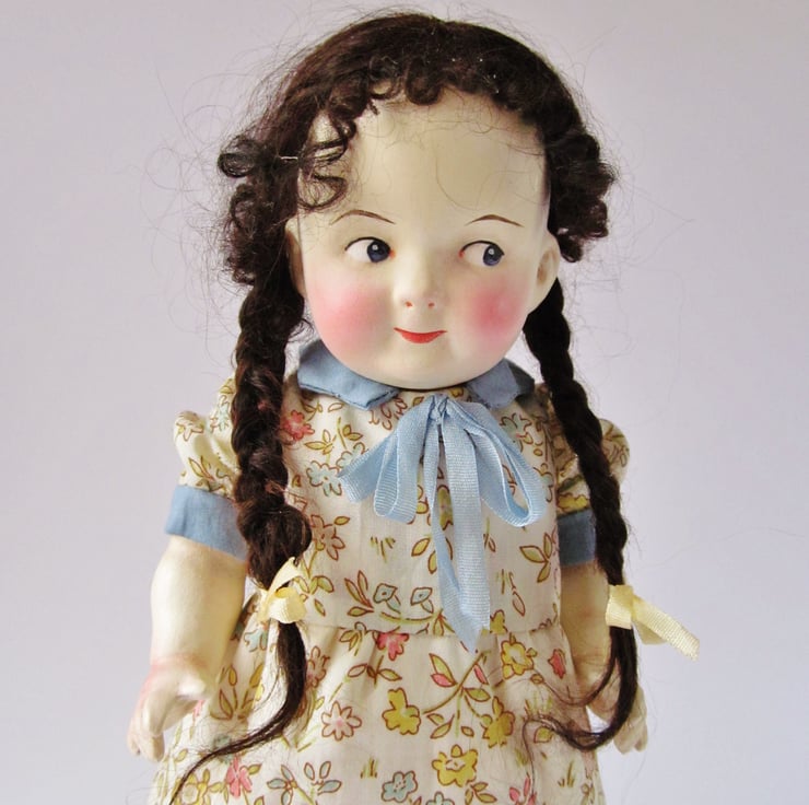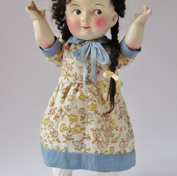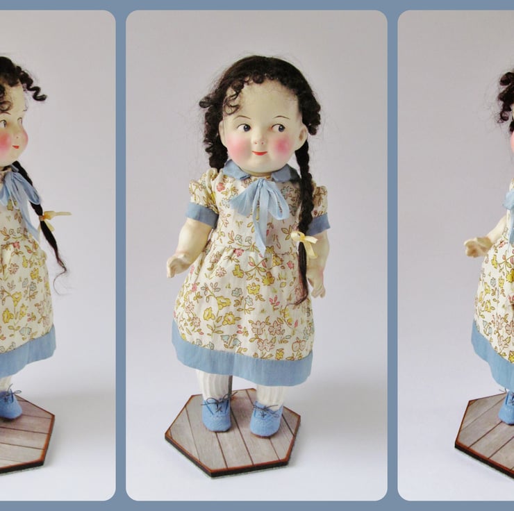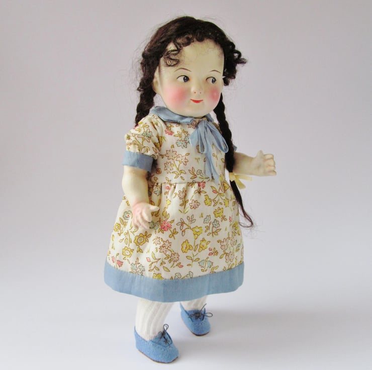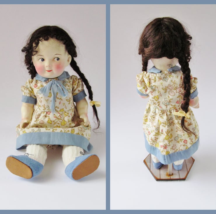 Antique Style Heubach Googly Doll, has been hand cast, painted and dressed in the style of of an early 20th century toy. Her hair is dark brown plaited alpaca, and her painted eyes are blue. She wears ivory cotton socks, and her blue shoes are made from ultra suede and leather.