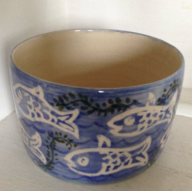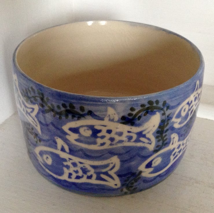 Charming blue and cream straight-sided cat bowl with fishes decoration. A perfect gift for the cat who has everything. It is 7.5 cms high and 12.5 cms across. It weighs 300g, a good weight to withstand being licked all round the kitchen! It has a hardwearing glossy transparent gaze for easy cleaning and is dishwasher and micrwave safe.