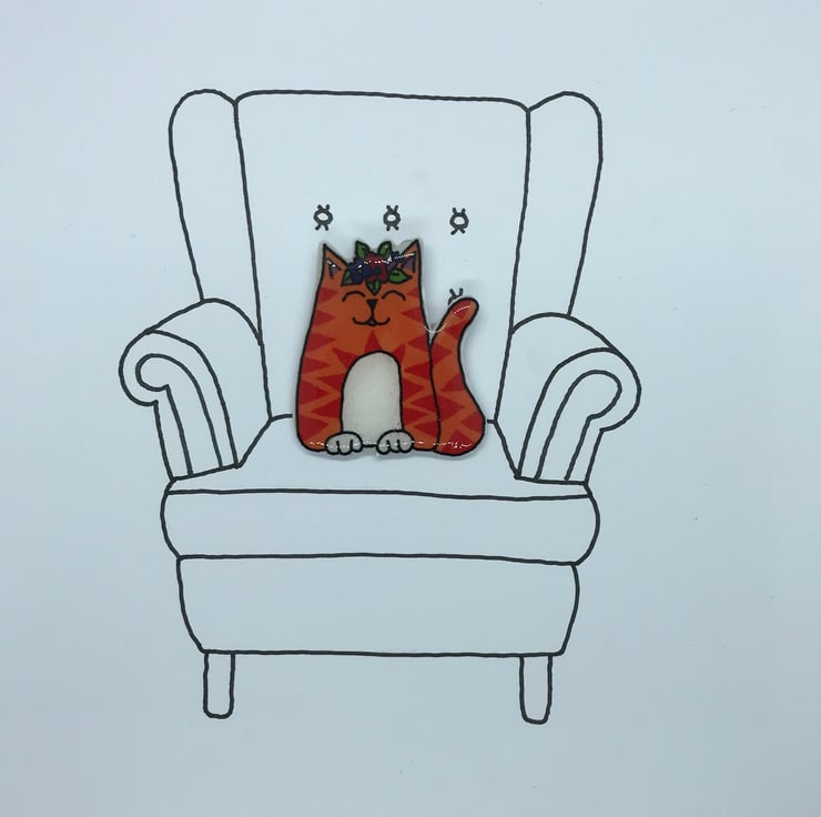 The puuurrrrfect gift for any cat lover. My little cat pins are taken from my original hand drawings. This little Ginger Tom Cat is wearing a crown of flowers and will sit pretty on any coat or bag