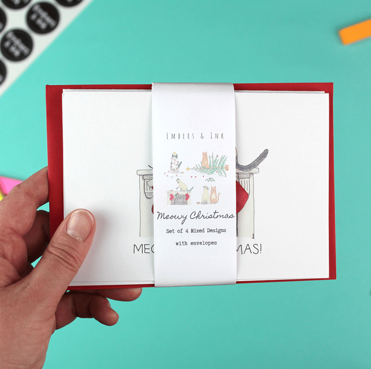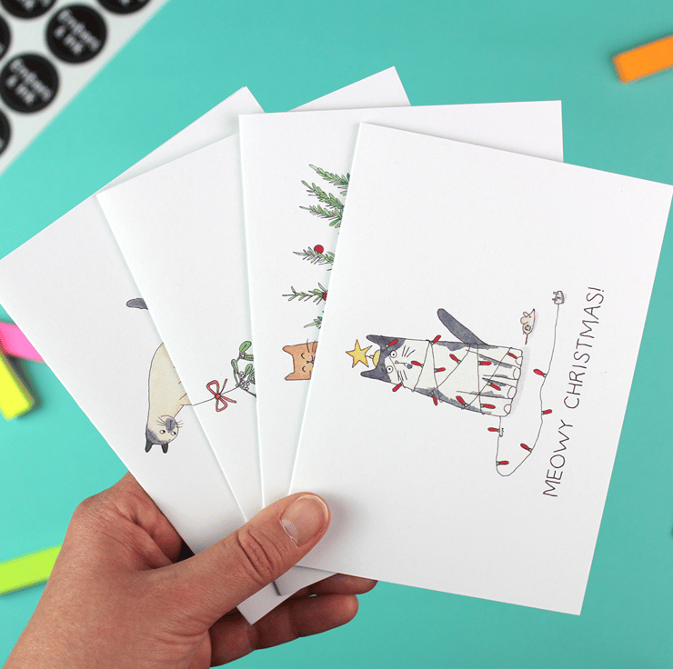Love cats? Know someone who does?! Say Merry Christmas in a feline way with this set of four Meowy Christmas cards, featuring four different illustrations of cats in Christmas scenes!