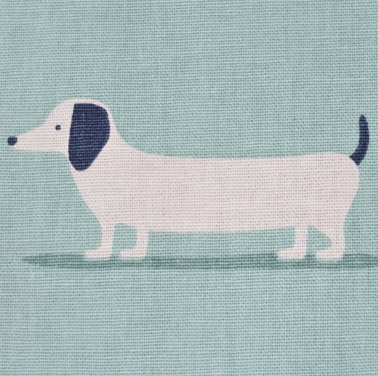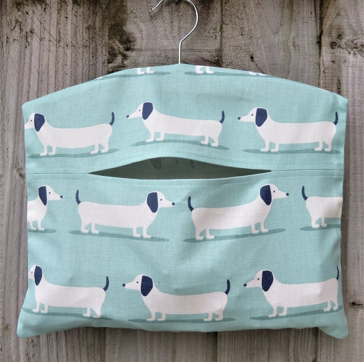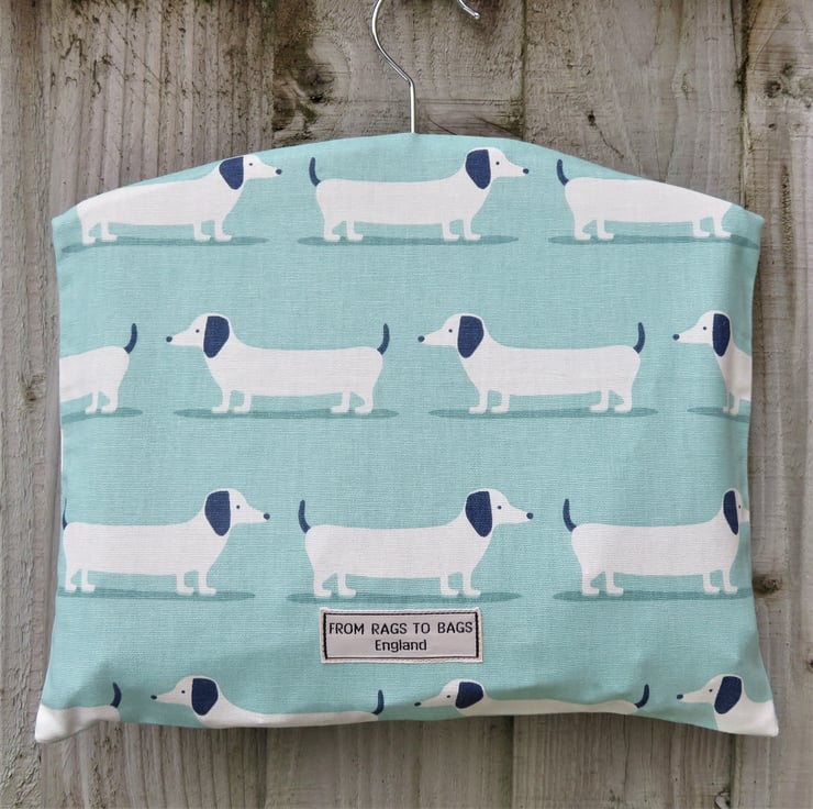 A cotton clothes peg bag with a Dachshund sausage dog print in on a duck egg blue background. The clothes peg bag measures approximately 34cm wide and 28cm long and has a wooden hanger in the top. The capacity is 75-100 clothes pegs.
