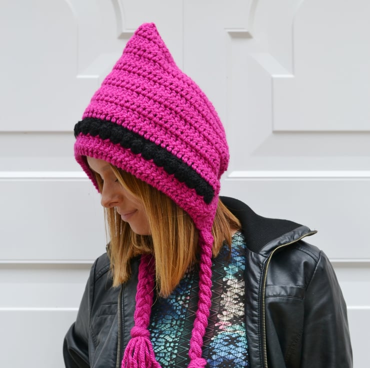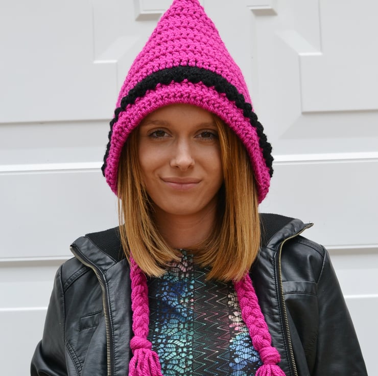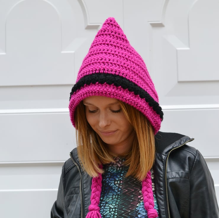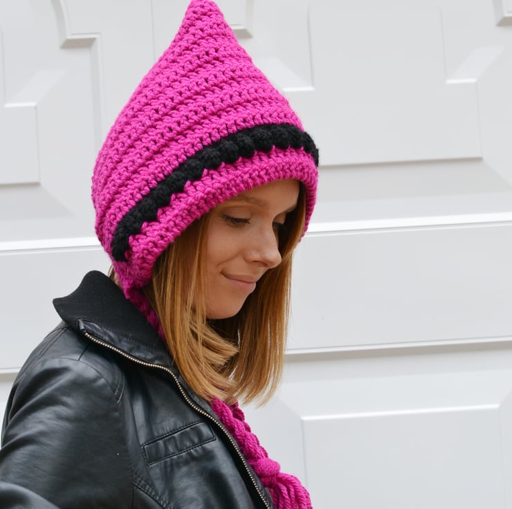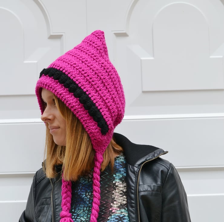 Crocheted pixie hood hat, a new design of mine and will be making this in different colours over the next few weeks. If you would like it made in a certain colour message me. Great for ladies who love to stay young and look good.