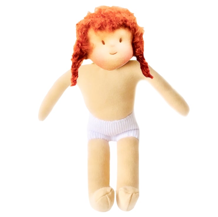 Violet is a cute little doll made from best quality CE safe de Witte doll skin from Holland. She is made using a technique very similar to the Waldorf method, is very soft and squeezable and sits down easily. Her hair is made from pure wild mohair and her cheeks are coloured with beeswax. She is 28cm tall and is CE safe but is not suitable for children under 3.